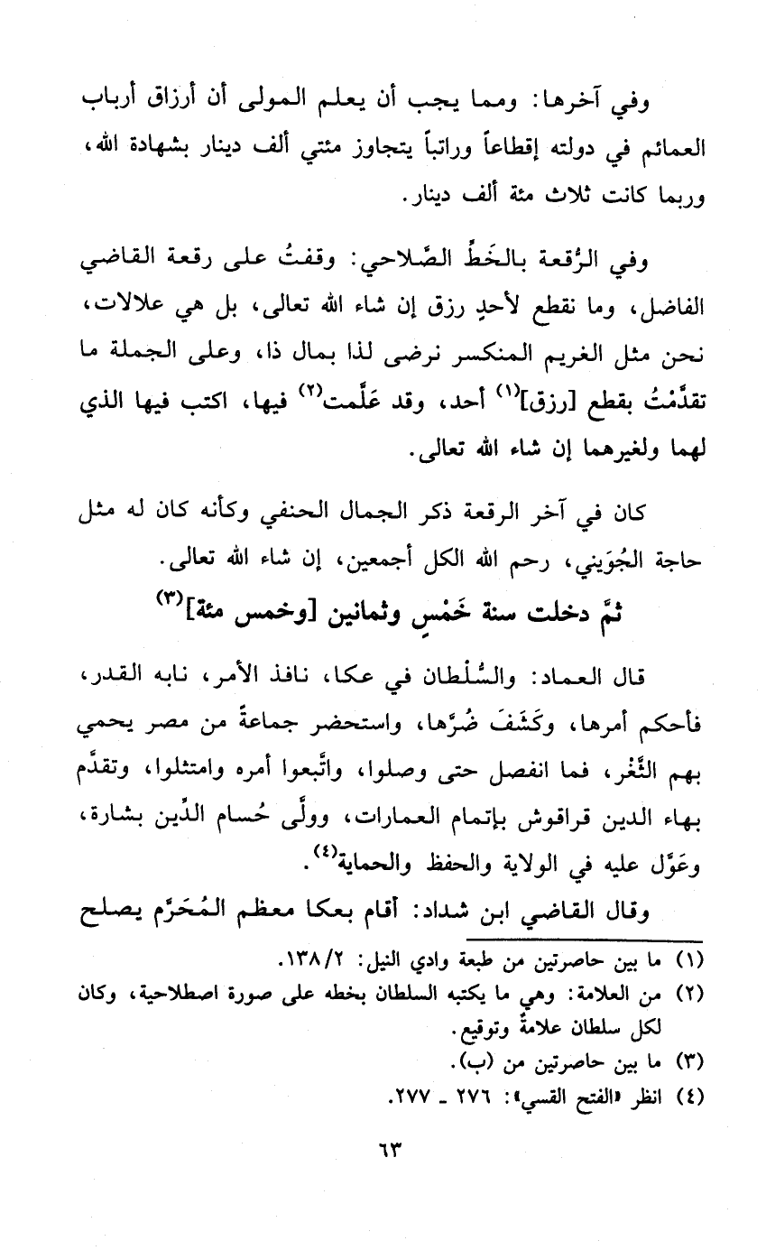 وَفِي آخرهَا وَمِمَّا يجب أَن يعلم الْمولى أَن أرزاق أَرْبَاب العمائم فِي دولته إقطاعا وراتبا يتَجَاوَز مئتي ألف دِينَار بِشَهَادَة الله وَرُبمَا كَانَت ثَلَاث مئة ألف دِينَار