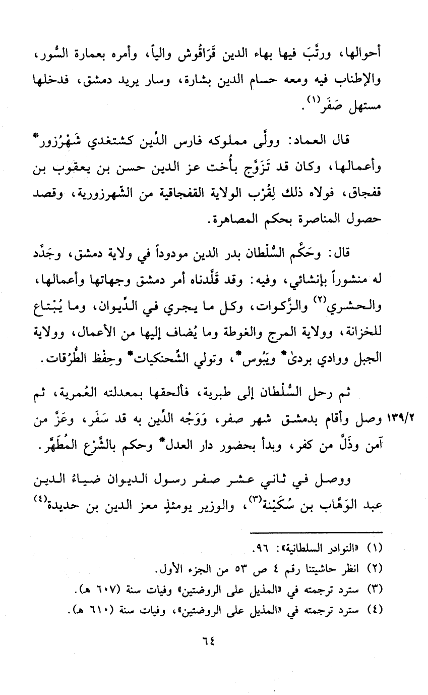 ثمَّ رَحل السُّلْطَان إِلَى طبرية فألحقها بمعدلته العمرية ثمَّ وصل وَأقَام بِدِمَشْق شهر صفر وَوجه الدّين بِهِ قد سفر وَعز من آمن وذل من كفر وَبَدَأَ بِحُضُور دَار الْعدْل وَحكم بِالشَّرْعِ المطهر