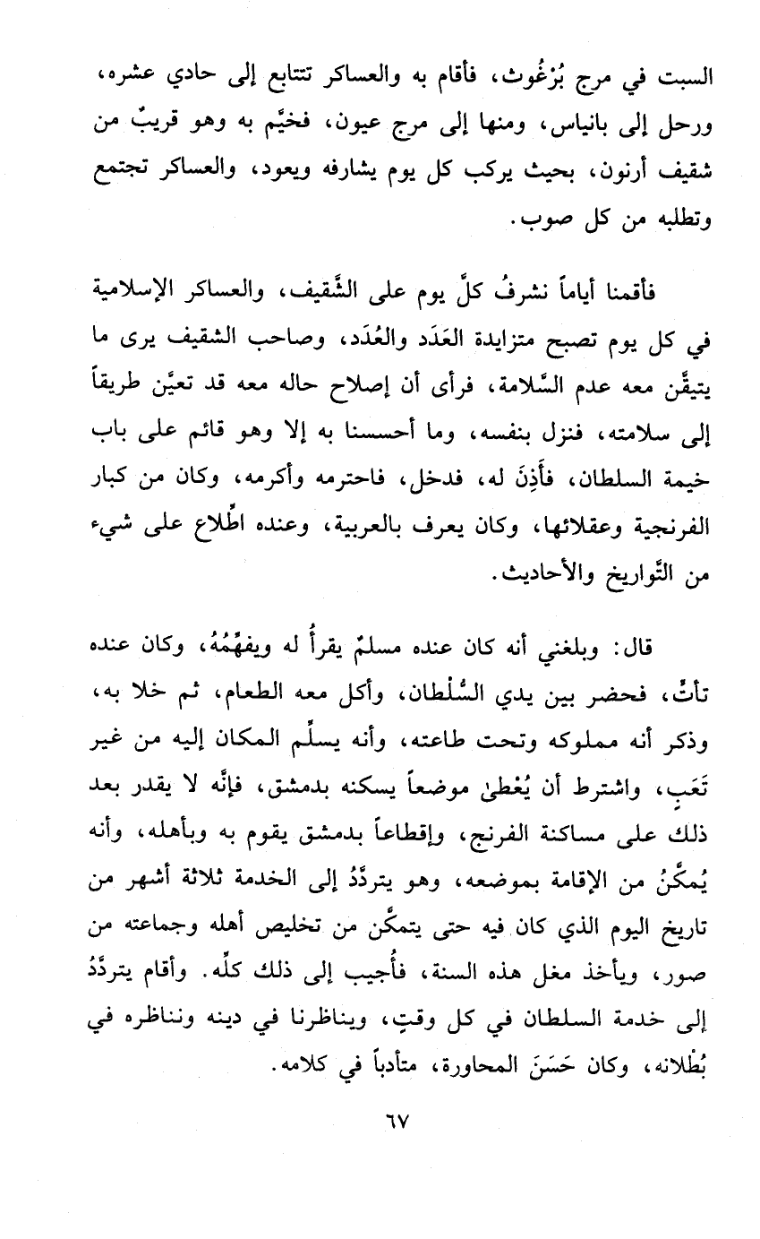 قَالَ وَبَلغنِي أَنه كَانَ عِنْده مُسلم يقْرَأ لَهُ ويفهمه وَكَانَ عِنْده تأت فَحَضَرَ بَين يَدي السُّلْطَان وَأكل مَعَه الطَّعَام ثمَّ خلا بِهِ وَذكر أَنه مَمْلُوكه وَتَحْت طَاعَته وَأَنه يسلم الْمَكَان إِلَيْهِ من غير تَعب وَاشْترط أَن يعْطى موضعا يسكنهُ بِدِمَشْق فَإِنَّهُ لَا يقدر بعد ذَلِك على مساكنة الفرنج وإقطاعا بِدِمَشْق يقوم بِهِ وبأهله وَأَنه يُمكن من الاقامة بموضعه وَهُوَ يتَرَدَّد إِلَى الْخدمَة ثَلَاثَة أشهر من تَارِيخ الْيَوْم الَّذِي كَانَ فِيهِ حَتَّى يتَمَكَّن من تَخْلِيص أَهله وجماعته من صور وَيَأْخُذ مغل هَذِه السّنة فَأُجِيب إِلَى ذَلِك كُله وَأقَام يتَرَدَّد إِلَى خدمَة السُّلْطَان فِي كل وَقت ويناظرنا فِي دينه ونناظره فِي بُطْلَانه وَكَانَ حسن المحاورة متأدبا فِي كَلَامه