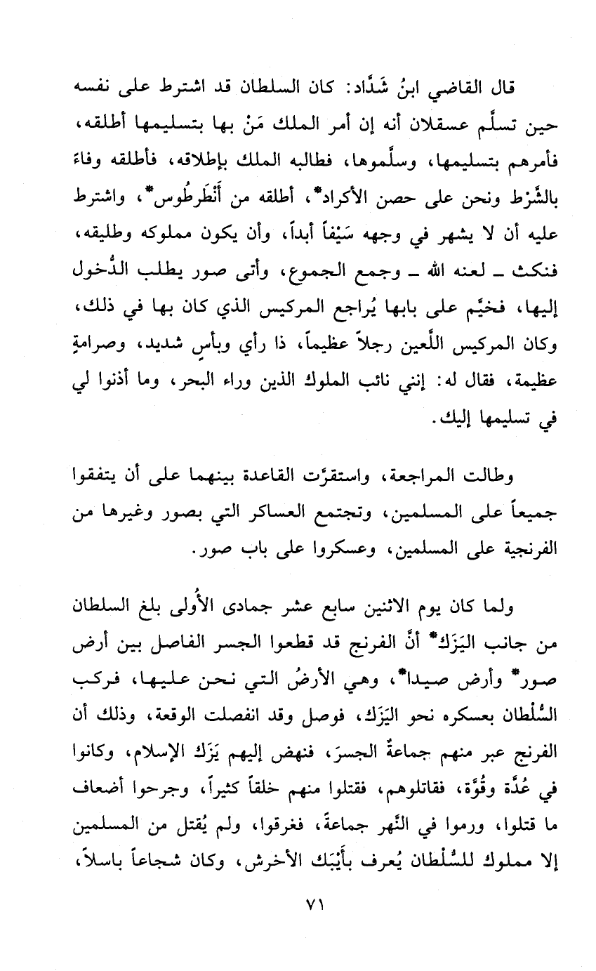 قَالَ القَاضِي ابْن شَدَّاد كَانَ السُّلْطَان قد اشْترط على نَفسه حِين تسلم عسقلان أَنه إِن أَمر الْملك من بهَا بتسليمها أطلقهُ فَأَمرهمْ بتسليمها وسلموها فطالبه الْملك باطلاقه فَأَطْلقهُ وَفَاء بِالشّرطِ وَنحن على حصن الأكراد أطلقهُ من أنطرطوس وَاشْترط عَلَيْهِ أَن لَا يشهر فِي وَجهه سَيْفا أبدا وَأَن يكون مَمْلُوكه وطليقه فنكث لعنة الله وَجمع الجموع وأتى صور يطْلب الدُّخُول إِلَيْهَا فخيم على بَابهَا يُرَاجع المركيس الَّذِي كَانَ بهَا فِي ذَلِك وَكَانَ المركيس اللعين رجلا عَظِيما ذَا رَأْي وبأس شَدِيد وصرامة عَظِيمَة فَقَالَ لَهُ إِنَّنِي نَائِب الْمُلُوك الَّذين وَرَاء الْبَحْر وَمَا أذنوا لي فِي تَسْلِيمهَا إِلَيْك