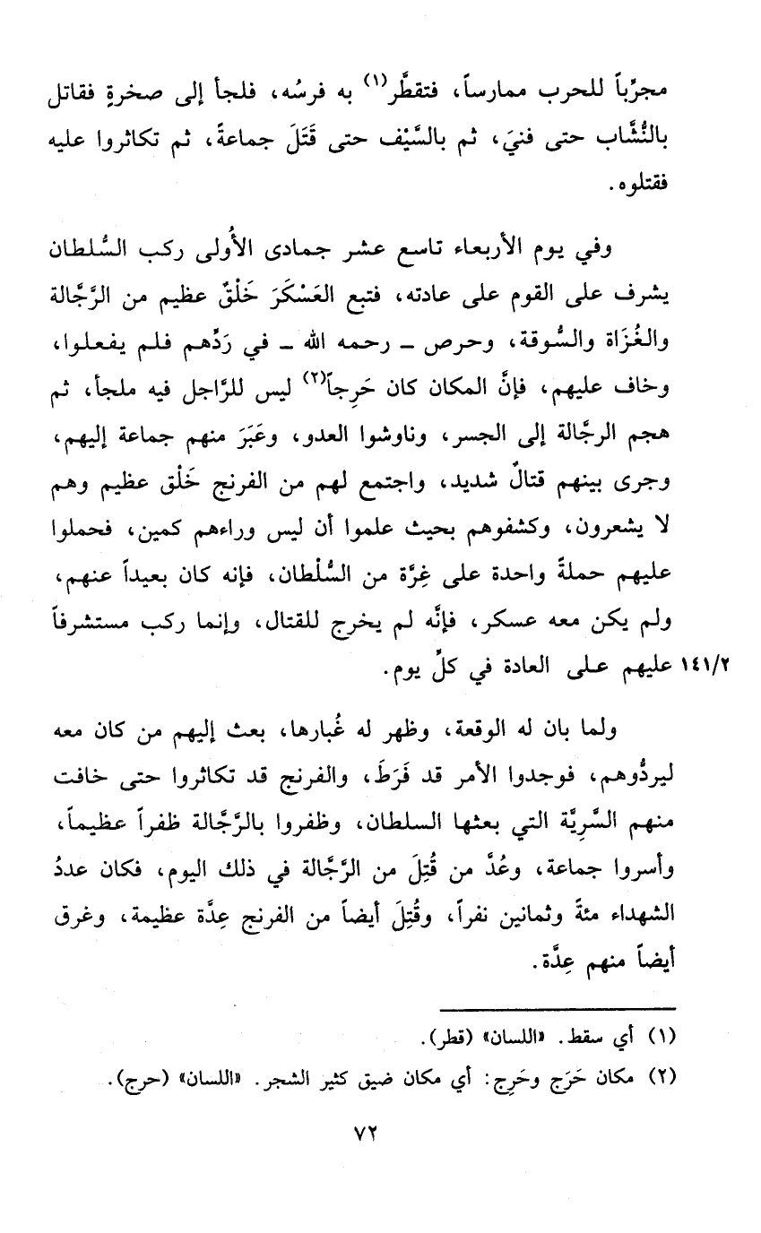 وَفِي يَوْم الْأَرْبَعَاء تَاسِع عشر جُمَادَى الأولى ركب السُّلْطَان يشرف على الْقَوْم على عَادَته فتبع الْعَسْكَر خلق عَظِيم من الرجالة والغزاة والسوقة وحرص رَحمَه الله فِي ردهم فَلم يَفْعَلُوا وَخَافَ عَلَيْهِم فَإِن الْمَكَان كَانَ حرجا لَيْسَ للراجل فِيهِ ملْجأ ثمَّ هجم الرجالة إِلَى الجسر وناوشوا الْعَدو وَعبر مِنْهُم جمَاعَة إِلَيْهِم وَجرى بَينهم قتال شَدِيد وإجتمع لَهُم من الفرنج خلق عَظِيم وهم لَا يَشْعُرُونَ وكشفوهم بِحَيْثُ علمُوا أَن لَيْسَ وَرَاءَهُمْ كمين فحملوا عَلَيْهِم حَملَة وَاحِدَة على غرَّة من السُّلْطَان فانه كَانَ بَعيدا عَنْهُم وَلم يكن مَعَه عَسْكَر فَإِنَّهُ لم يخرج لِلْقِتَالِ وَإِنَّمَا ركب مستشرفا عَلَيْهِم على الْعَادة فِي كل يَوْم