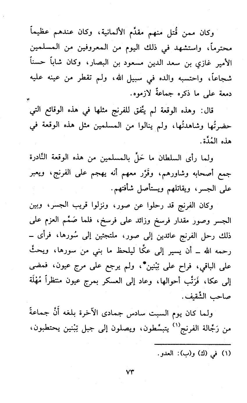 وَكَانَ الفرنج قد رحلوا عَن صور ونزلوا قريب الجسر وَبَين الجسر وصور مِقْدَار فَرسَخ وزائد على فَرسَخ فَلَمَّا صمم الْعَزْم على ذَلِك رَحل الفرنج عائدين إِلَى صور ملتجئين إِلَى سورها فَرَأى رَحمَه الله أَن يسير إِلَى عكا ليلحظ مَا بني من سورها ويحث على الْبَاقِي فراح على تبنين وَلم يرجع على مرج عُيُون فَمضى إِلَى عكا فرتب أحوالها وَعَاد إِلَى الْعَسْكَر بمرج عُيُون منتظرا مهلة صَاحب الشقيف