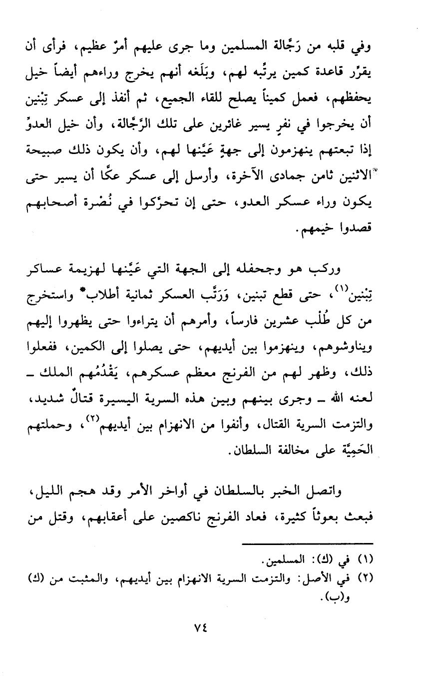وَركب هُوَ وجحفله إِلَى الْجِهَة الَّتِي عينهَا لهزيمة عَسَاكِر تبنين حَتَّى قطع تبنين ورتب الْعَسْكَر ثَمَانِيَة أطلاب واستخرج من كل طلب عشْرين فَارِسًا وَأمرهمْ أَن يتراءوا حَتَّى يظهروا إِلَيْهِم ويناوشوهم وينهزموا بَين أَيْديهم حَتَّى يصلوا إِلَى الكمين فَفَعَلُوا ذَلِك وَظهر لَهُم من الفرنج مُعظم عَسْكَرهمْ يقدمهم الْملك لَعنه الله وَجرى بَينهم وَبَين هَذِه السّريَّة الْيَسِيرَة قتال شَدِيد والتزمت السّريَّة الْقِتَال وأنفوا من الانهزام بَين أَيْديهم وحملتهم الحمية على مُخَالفَة السُّلْطَان