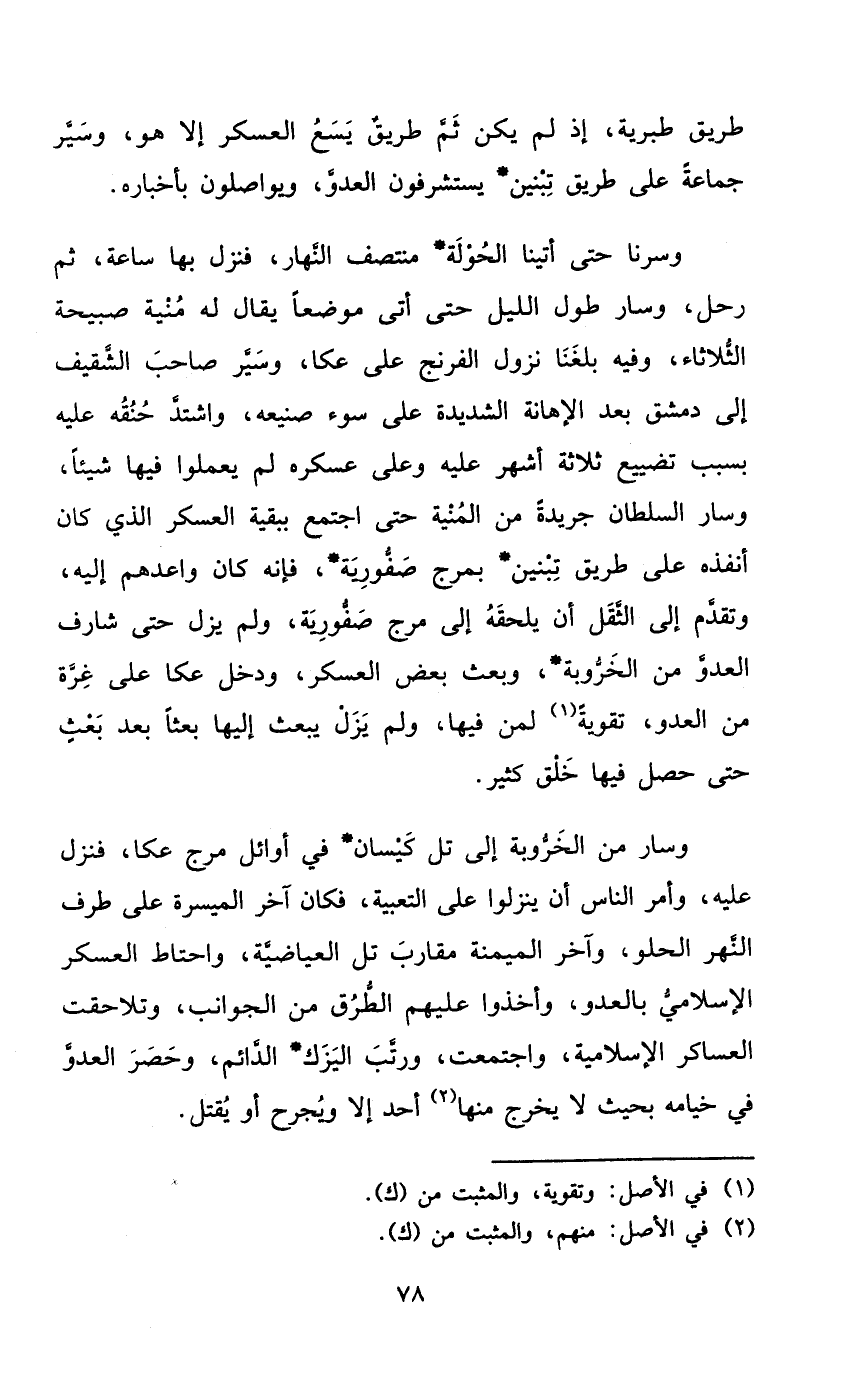 وسرنا حَتَّى أَتَيْنَا الحولة منتصف النَّهَار فَنزل بهَا سَاعَة ثمَّ رَحل وَسَار طول اللَّيْل حَتَّى أَتَى موضعا يُقَال لَهُ منية صَبِيحَة الثُّلَاثَاء وَفِيه بلغنَا نزُول الفرنج على عكا وسير صَاحب الشقيف إِلَى دمشق بعد الاهانة الشَّدِيدَة على سوء صَنِيعه وَاشْتَدَّ حنقه عَلَيْهِ بِسَبَب تَضْييع ثَلَاثَة أشهر عَلَيْهِ وعَلى عسكره لم يعملوا فِيهَا شَيْئا وَسَار السُّلْطَان جَرِيدَة من الْمنية حَتَّى اجْتمع بِبَقِيَّة الْعَسْكَر الَّذِي كَانَ أنفذه على طَرِيق تبنين بمرج صفورية فَإِنَّهُ كَانَ واعدهم إِلَيْهِ وَتقدم إِلَى الثّقل أَن يلْحقهُ إِلَى مرج صفورية وَلم يزل حَتَّى شَارف العدومن الخروبة وَبعث بعض الْعَسْكَر وَدخل عكا على غرَّة من الْعَدو تقويه لمن فِيهَا وَلم يزل يبْعَث إِلَيْهَا بعثا بعد بعث حَتَّى حصل فِيهَا خلق كثير