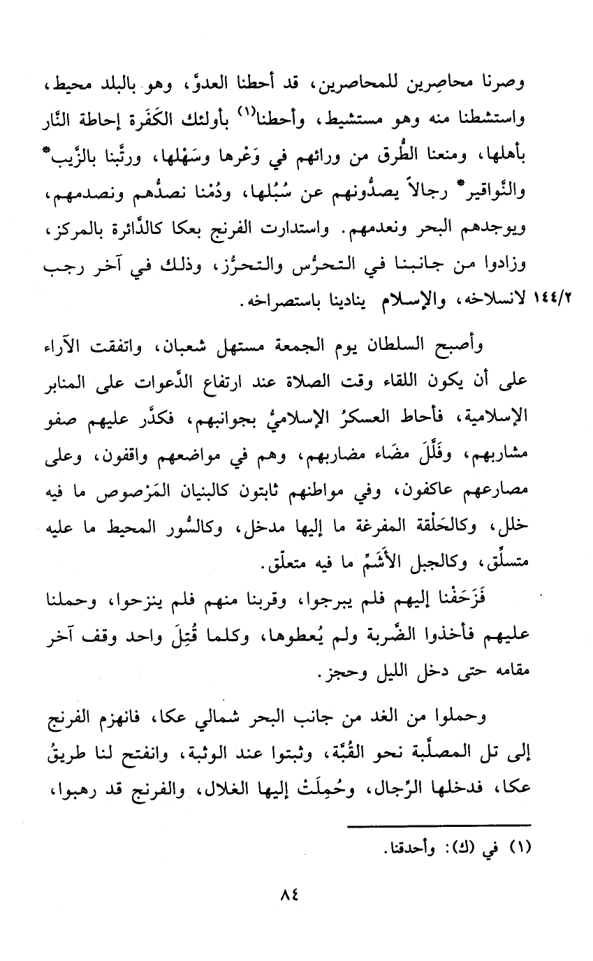 وصرنا محاصرين للمحاصرين قد أحطنا الْعَدو وَهُوَ بِالْبَلَدِ مُحِيط واستشطنا مِنْهُ وَهُوَ مستشيط وأحطنا بأولئك الْكَفَرَة إحاطة النَّار بِأَهْلِهَا ومنعنا الطّرق من ورائهم فِي وعرها وسهلها ورتبنا بالزيب والنواقير رجَالًا يصدونهم عَن سبلها ودمنا نصدهم ونصدمهم ويوجدهم الْبَحْر ونعدمهم واستدارت الفرنج بعكا كالدائرة بالمركز وَزَادُوا من جانبنا فِي التحرس والتحرز وَذَلِكَ فِي آخر رَجَب لانسلاخه وَالْإِسْلَام ينادينا باستصراخه