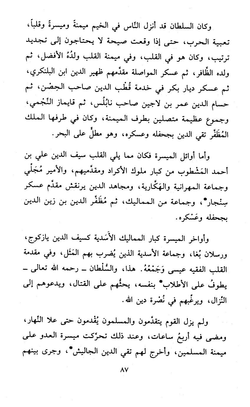 وَكَانَ السُّلْطَان قد أنزل النَّاس فِي الخيم ميمنة وميسرة وَقَلْبًا تعبية الْحَرْب حَتَّى إِذا وَقعت صَيْحَة لَا يَحْتَاجُونَ إِلَى تَجْدِيد تَرْتِيب وَكَانَ هُوَ فِي الْقلب وَفِي ميمنة الْقلب وَلَده الْأَفْضَل ثمَّ وَلَده الظافر ثمَّ عَسْكَر المواصلة مقدمهم ظهير الدّين ابْن البلنكري ثمَّ عَسْكَر ديار بكر فِي خدمَة قطب الدّين صَاحب الْحصن ثمَّ حسام الدّين عمر بن لاجين صَاحب نابلس ثمَّ قايماز النجمي وجموع عَظِيمَة متصلين بِطرف الميمنة وَكَانَ فِي طرفها الْملك المظفر تَقِيّ الدّين بجحفله وَعَسْكَره وهومطل على الْبَحْر