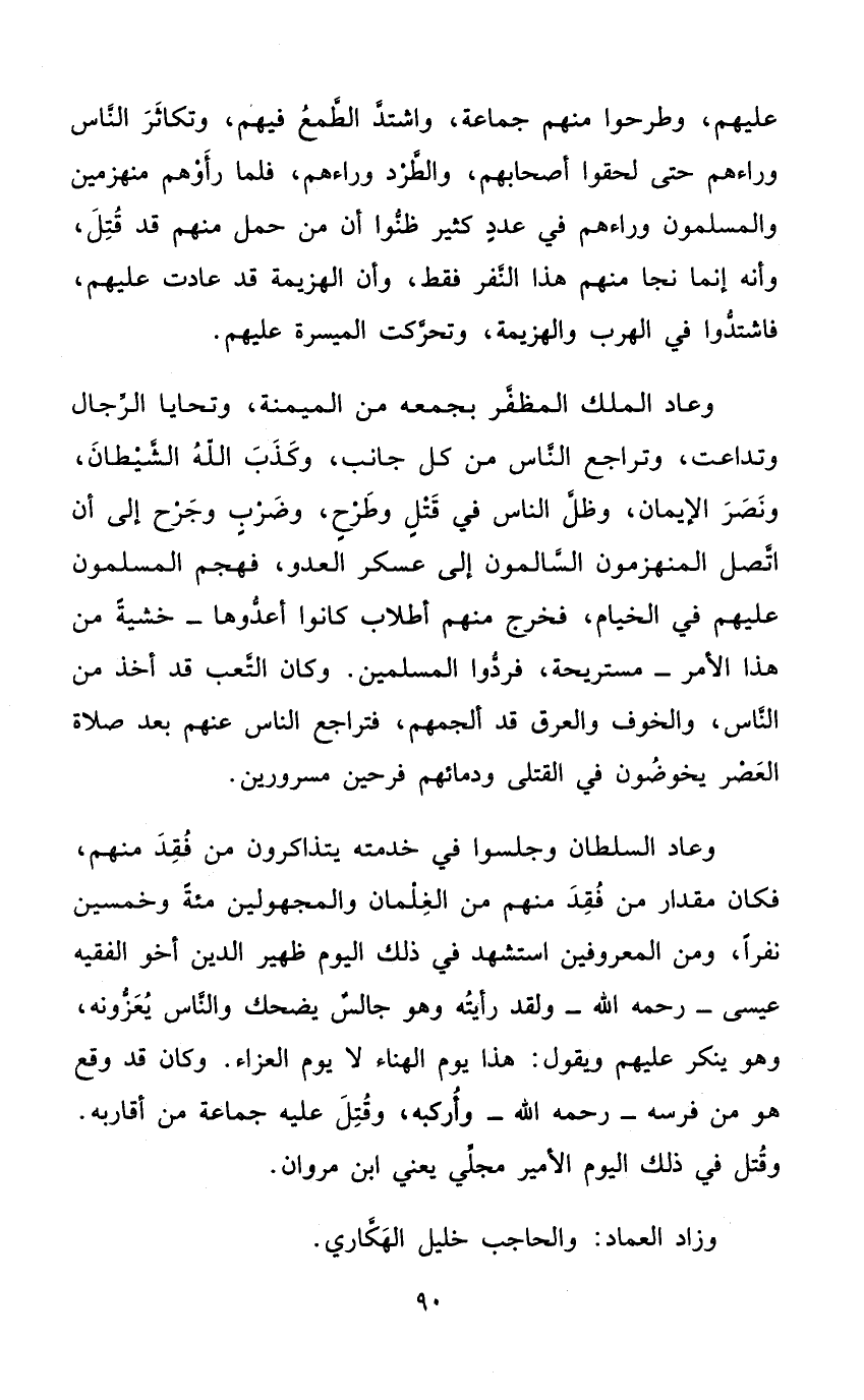 وَعَاد السُّلْطَان وجلسوا فِي خدمته يتذاكرون من فقد مِنْهُم فَكَانَ مِقْدَار من فقد مِنْهُم من الغلمان والمجهولين مئة وَخمسين نَفرا وَمن المعروفين اسْتشْهد فِي ذَلِك الْيَوْم ظهير الدّين أَخُو الْفَقِيه عِيسَى - رَحمَه الله - وَلَقَد رَأَيْته وهوجالس يضْحك وَالنَّاس يعزونه وَهُوَ يُنكر عَلَيْهِم وَيَقُول هَذَا يَوْم الهناء لَا يَوْم العزاء وَكَانَ قد وَقع هُوَ من فرسه - رَحمَه الله - وأركبه وَقتل عَلَيْهِ جمَاعَة من أَقَاربه وَقتل فِي ذَلِك الْيَوْم الْأَمِير مجلي يَعْنِي ابْن مَرْوَان