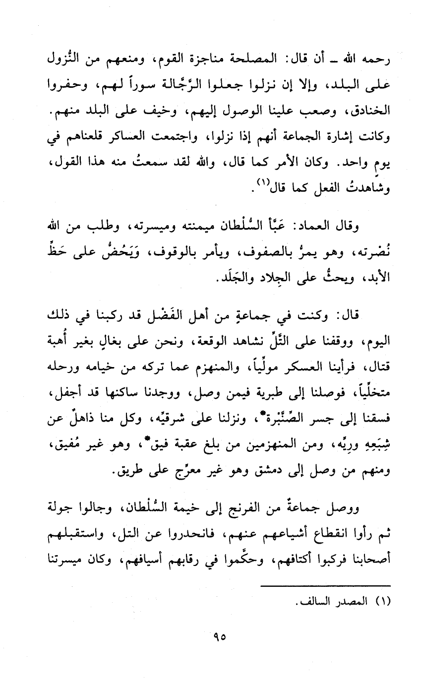 قَالَ وَكنت فِي جمَاعَة من أهل الْفضل قد ركبنَا فِي ذَلِك الْيَوْم ووقفنا على التل نشاهد الْوَقْعَة وَنحن على بغال بِغَيْر أهبة قتال فَرَأَيْنَا الْعَسْكَر موليا والمنهزم عَمَّا تَركه من خيامه ورحله متخليا فوصلنا إِلَى طبرية فِيمَن وصل وَوجدنَا ساكنها قد أجفل فسقنا إِلَى جسر الصنبرة ونزلنا على شرقيه وكل منا ذاهل عَن شبعه وريه وَمن المنهزمين من بلغ عقبَة فيق وَهُوَ غير مُفِيق وَمِنْهُم من وصل إِلَى دمشق وَهُوَ غير معرج على طَرِيق
