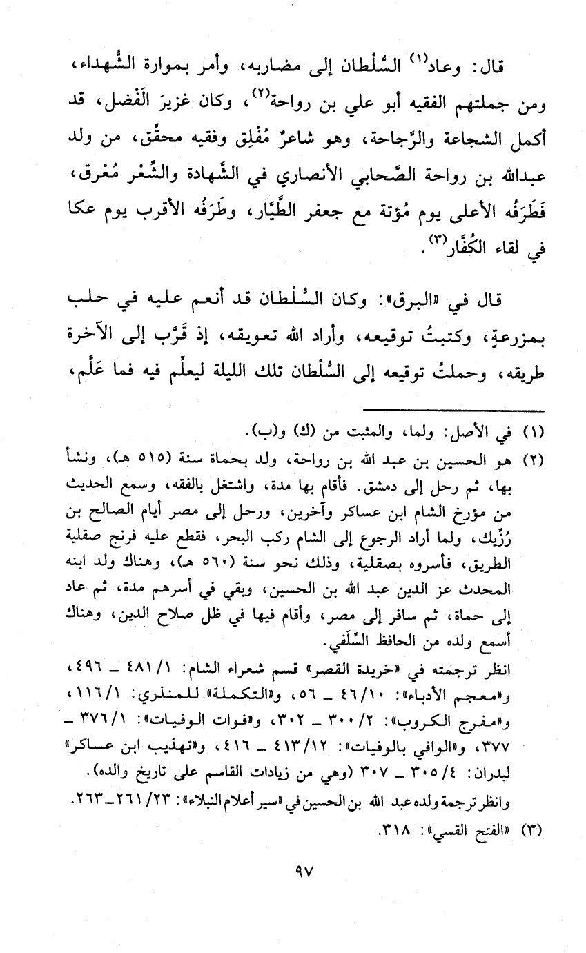 قَالَ وَعَاد السُّلْطَان إِلَى مضاربه وَأمر بموارة الشُّهَدَاء وَمن جُمْلَتهمْ الْفَقِيه أَبُو عَليّ بن رَوَاحه وَكَانَ غزير الْفضل قد أكمل الشجَاعَة والرجاحة وَهُوَ شَاعِر مفلق وفقيه مُحَقّق من ولد عبد الله بن رَوَاحَة الصَّحَابِيّ الْأنْصَارِيّ فِي الشَّهَادَة وَالشعر معرق فطرفه الْأَعْلَى يَوْم مُؤْتَة مَعَ جَعْفَر الطيار وطرفه الْأَقْرَب يَوْم عكا فِي لِقَاء الْكفَّار