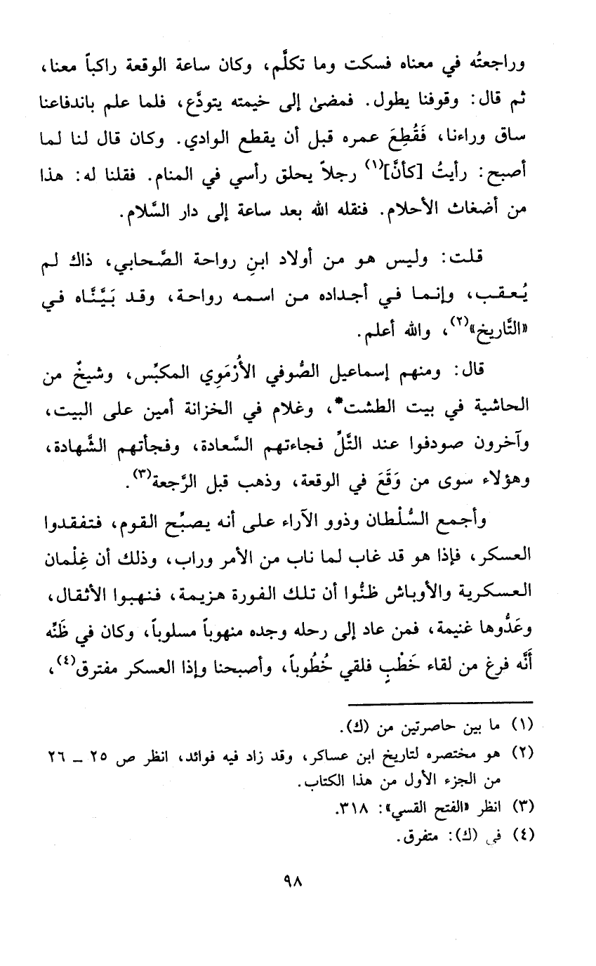 وراجعته فِي مَعْنَاهُ فَسكت وَمَا تكلم وَكَانَ سَاعَة الْوَقْعَة رَاكِبًا مَعنا ثمَّ قَالَ وقوفنا يطول فَمضى إِلَى خيمته يتودع فَلَمَّا علم باندفاعنا سَاق وَرَاءَنَا فَقطع عمره قبل أَن يقطع الْوَادي وَكَانَ قَالَ لنا لما أصبح رَأَيْت كَأَن رجلا يحلق رَأْسِي فِي الْمَنَام فَقُلْنَا لَهُ هَذَا من أضغاث الأحلام فنقله الله بعد سَاعَة إِلَى دَار السَّلَام