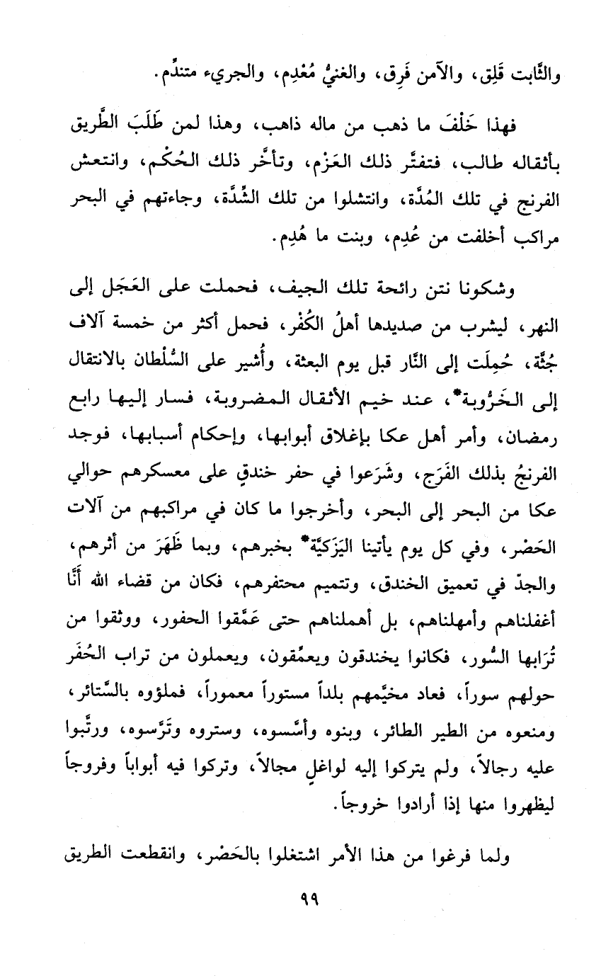 فَهَذَا خلف مَا ذهب من مَاله ذَاهِب وَهَذَا لمن طلب الطَّرِيق بأثقاله طَالب فتفتر ذَلِك الْعَزْم وَتَأَخر ذَلِك الحكم وانتعش الفرنج فِي تِلْكَ الْمدَّة وانتشلوا من تِلْكَ الشدَّة وجاءتهم فِي البحرمراكب أخلفت من عدم وَبنت مَا هدم