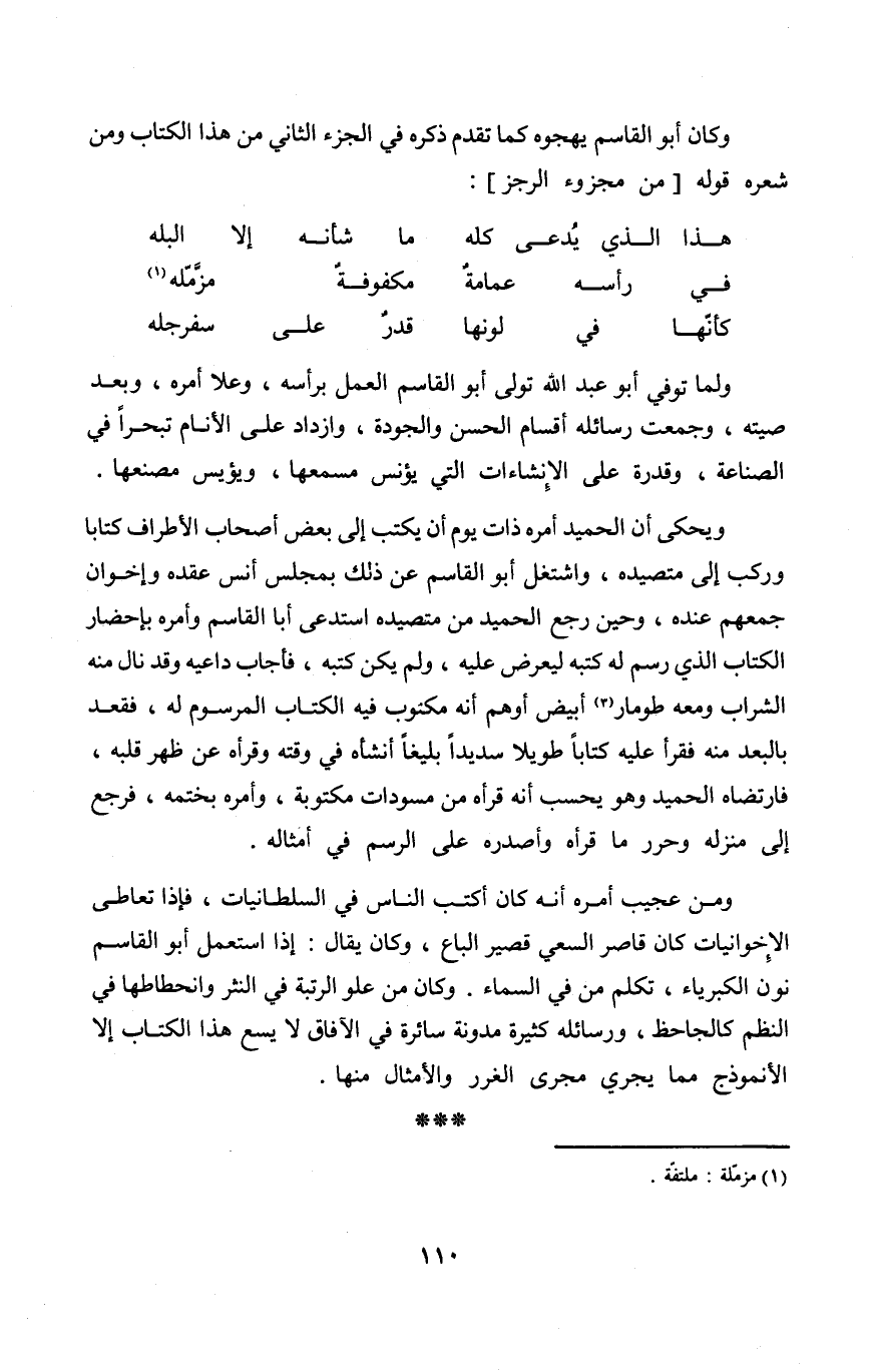 وَمن عَجِيب أمره أَنه كَانَ أكتب النَّاس فِي السلطانيات فَإِذا تعاطى الإخوانيات كَانَ قَاصِر السَّعْي قصير الباع وَكَانَ يُقَال إِذا اسْتعْمل أَبُو الْقَاسِم نون الْكِبْرِيَاء تكلم من فِي السَّمَاء