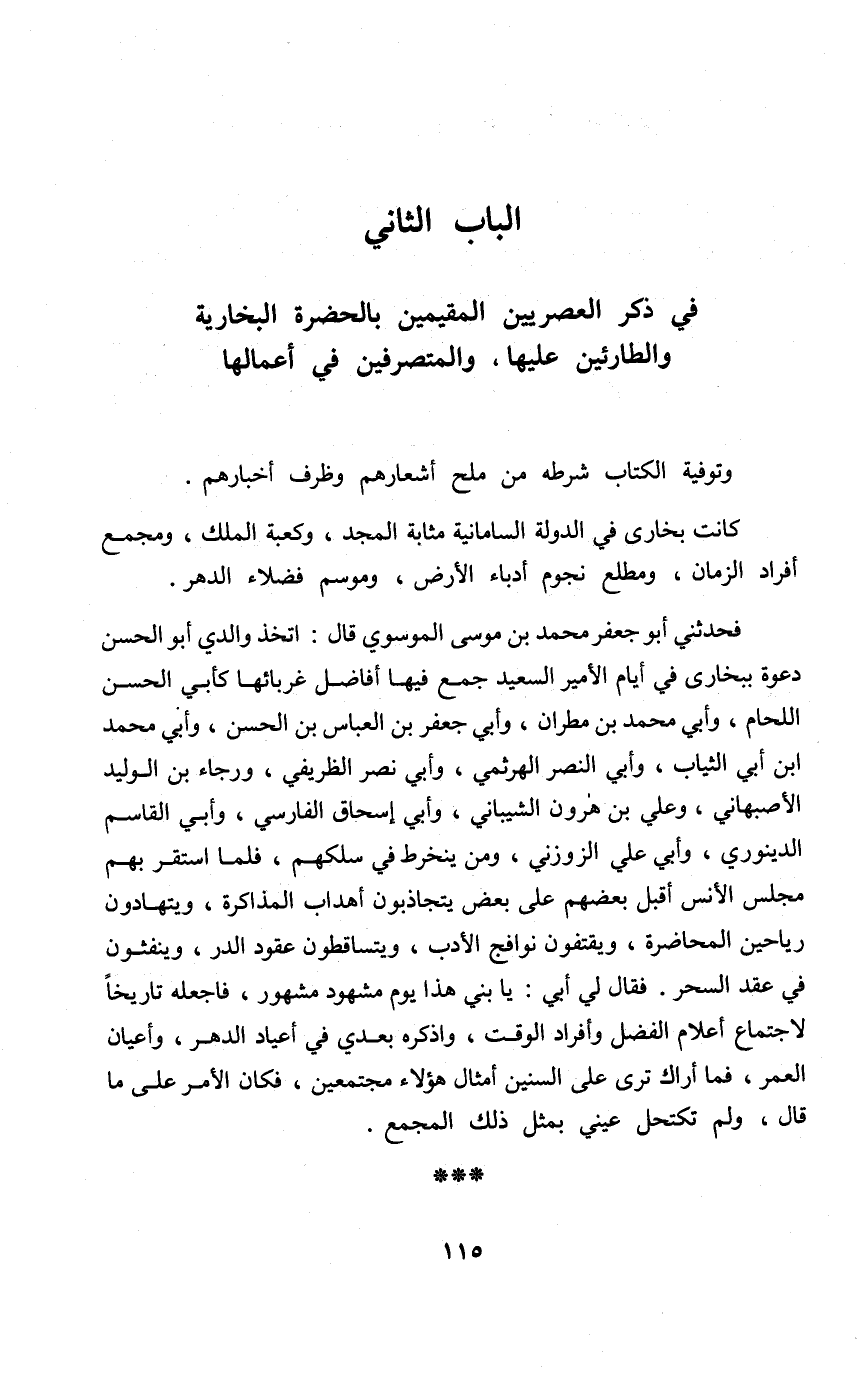 فَحَدثني أَبُو جَعْفَر مُحَمَّد بن مُوسَى الموسوي قَالَ اتخذ وَالِدي أَبُو الْحسن دَعْوَة ببخارى فِي أَيَّام الْأَمِير السعيد جمع فِيهَا أفاضل غربائها كَأبي الْحسن اللحام وَأبي مُحَمَّد بن مطران وَأبي جَعْفَر بن الْعَبَّاس بن الْحسن وَأبي مُحَمَّد ابْن أبي الثِّيَاب وَأبي النَّصْر الهرثمي وَأبي نصر الظريفي ورجاء بن الْوَلِيد الْأَصْبَهَانِيّ وَعلي بن هَارُون الشَّيْبَانِيّ وَأبي إِسْحَاق الْفَارِسِي وَأبي الْقَاسِم الدينَوَرِي وَأبي عَليّ الزوزني وَمن ينخرط فِي سلكهم فَلَمَّا اسْتَقر بهم مجْلِس الْأنس أقبل بَعضهم على بعض يتجاذبون أهداب المذاكرة ويتهادون رياحين المحاضرة ويقتفون نوافج الْأَدَب ويتساقطون عُقُود الدّرّ وينفثون فِي عقد السحر