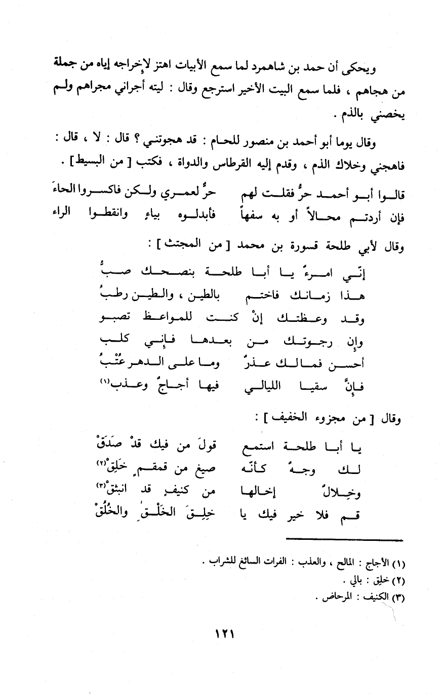 وَقَالَ يَوْمًا أَبُو أَحْمد بن مَنْصُور للحام قد هجوتني قَالَ لَا قَالَ فاهجني وخلاك الذَّم وَقدم إِلَيْهِ القرطاس والدواة فَكتب