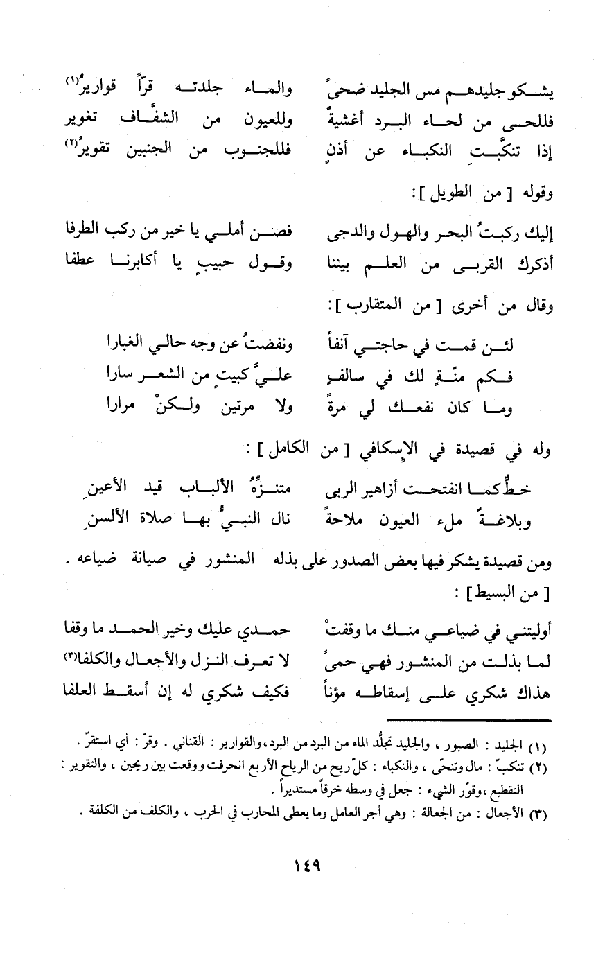 (يشكو جليدهم مس الجليد ضحى ... وَالْمَاء جلدته قرا قَوَارِير)