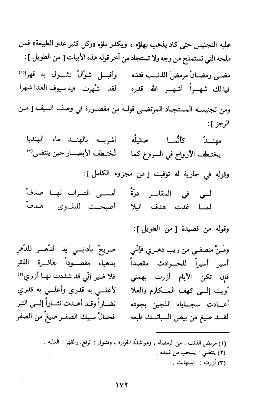 عَلَيْهِ التَّجْنِيس حَتَّى كَاد يذهب بهاؤه ويكدر مَاؤُهُ وكل كثير عَدو الطبيعة فَمن ملحه الَّتِي تستملح من وَجه وَلَا تستجاد من آخر قَوْله هَذِه الأبيات