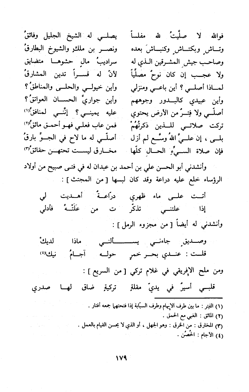 (تركت صَلَاتي للَّذين ذكرتهم ... فَمن عَابَ فعلي فَهُوَ أَحمَق مائق)