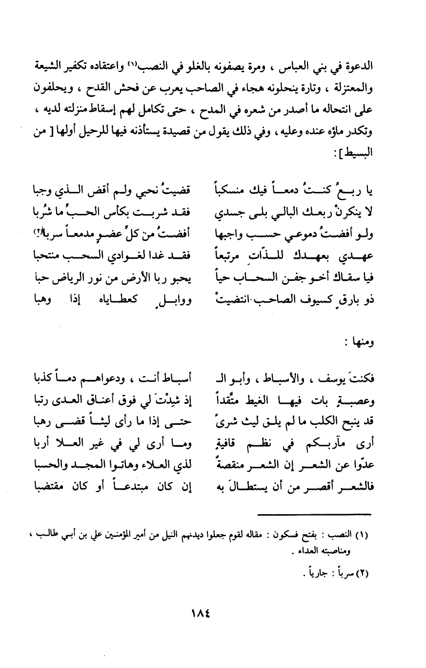 الدعْوَة فِي بني الْعَبَّاس وَمرَّة يصفونه بالغلو فِي النصب واعتقاده تَكْفِير الشِّيعَة والمعتزلة وَتارَة ينحلونه هجاء فِي الصاحب يعرب عَن فحش الْقدح ويحلفون على انتحاله مَا أصدر من شعره فِي الْمَدْح حَتَّى تَكَامل لَهُم إِسْقَاط مَنْزِلَته لَدَيْهِ وتكدر مَاؤُهُ عِنْده وَعَلِيهِ وَفِي ذَلِك يَقُول من قصيدة يَسْتَأْذِنهُ فِيهَا للرحيل أَولهَا