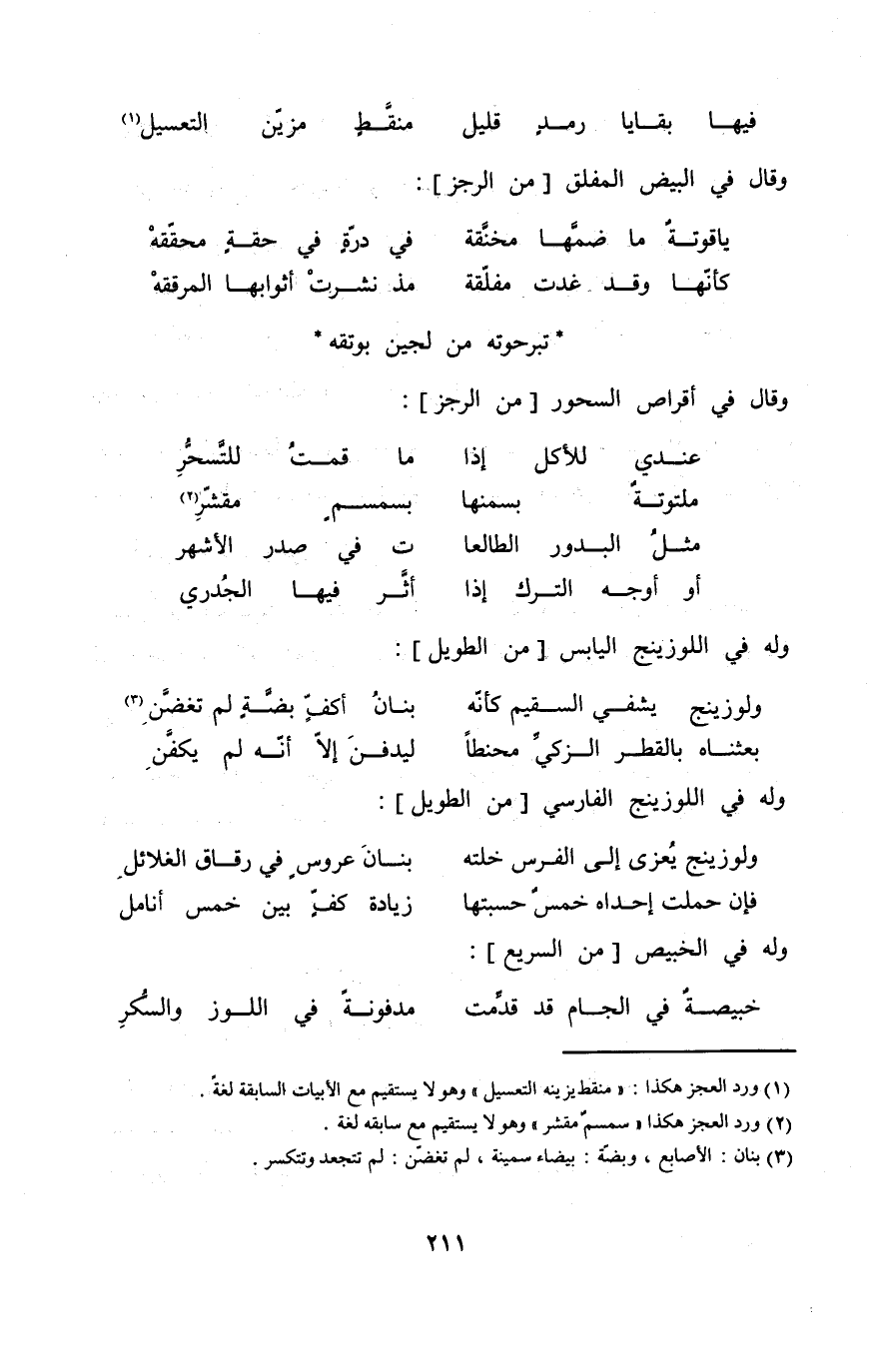 (فِيهَا بقايا رمد قَلِيل ... منقط مزين التعسيل) // من الرجز //