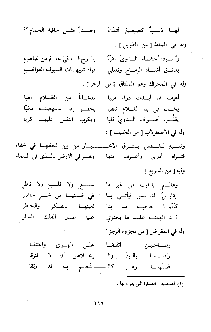 (لَهَا ذَنْب كصيصية أتمت ... وَصدر مثل خافية الْحمام) // من الوافر //
