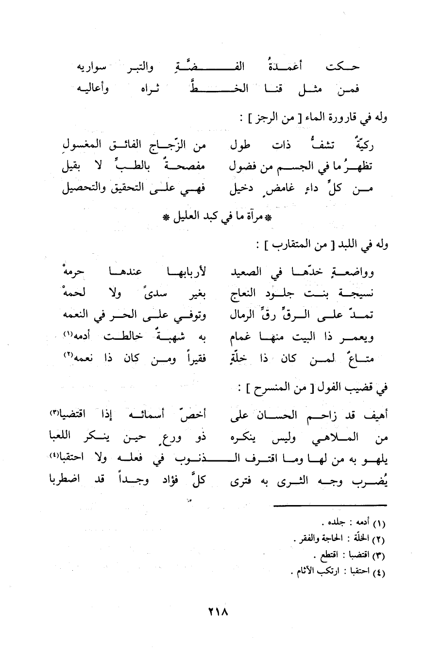 (تظهر مَا فِي الْجِسْم من فضول ... مفصحة بالطب لَا بقيل)