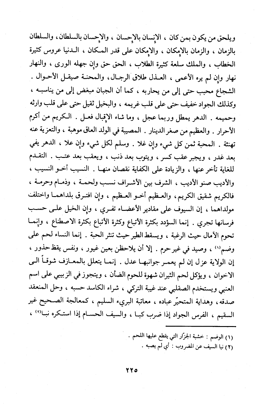 إِنَّمَا يتعلل بالمعازف شوقا إِلَى الأخوان ويؤكل لحم الثيران شَهْوَة للحوم الضَّأْن ويتجوز فِي الزبيبي على اسْم العنبي ويستخدم الصقلبي عِنْد غيبَة التركي شِرَاء الكاسد حَسبه وَحل المنعقد صدقه وهداية المتحير عباده معاتبة البريء السَّلِيم كمعالجة الصَّحِيح غير السقيم الْفرس الْجواد إِذا ضرب كبا وَالسيف الحسام إِذا استكره نبا
