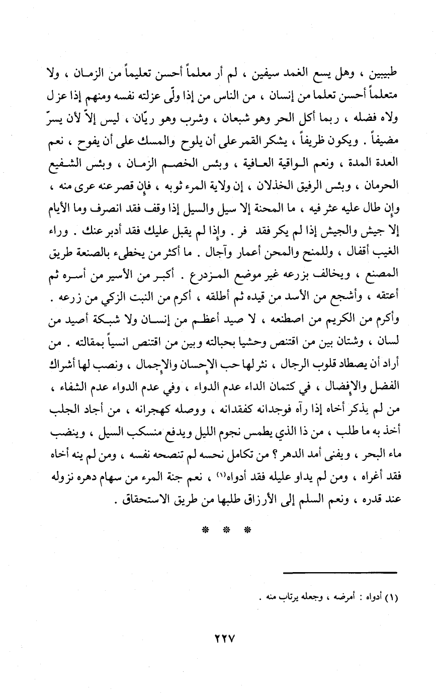 من أَرَادَ أَن يصطاد قُلُوب الرِّجَال نثر لَهَا حب الْإِحْسَان والإجمال وَنصب لَهَا أشراك الْفضل والإفضال فِي كتمان الدَّاء عدم الدَّوَاء وَفِي عدم الدَّوَاء عدم الشِّفَاء من لم يذكر أَخَاهُ إِذا رَآهُ فوجدناه كفقدانه وَوَصله كهجرانه من أَجَاد الجلب أَخذ بِهِ مَا طلب من ذَا الَّذِي يطمس نُجُوم اللَّيْل وَيدْفَع منسكب السَّيْل وينضب مَاء الْبَحْر ويفنى أمد الدَّهْر من تَكَامل نحسه لم تنصحه نَفسه وَمن لم ينْه أَخَاهُ فقد أغراه وَمن لم يداو عليله فقد أدواه نعم جنَّة الْمَرْء من سِهَام دهره نُزُوله عِنْد قدره وَنعم السّلم إِلَى الأرزاق طلبَهَا من طَرِيق الِاسْتِحْقَاق
