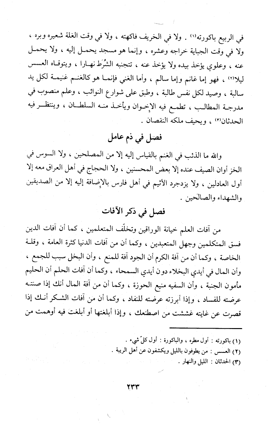 من آفَات الْعلم خِيَانَة الوراقين وتخلف المتعلمين كَمَا أَن آفَات الدّين فسق الْمُتَكَلِّمين وَجَهل المتعبدين وكما أَن من آفَات الدُّنْيَا كَثْرَة الْعَامَّة وَقلة الْخَاصَّة وكما أَن من آفَة الْكَرم أَن الْجُود آفَة للْمَنْع وَأَن الْبُخْل سَبَب للْجمع وَأَن المَال فِي أَيدي البخلاء دون أَيدي السمحاء وكما أَن آفَات الْحلم أَن الْحَلِيم مَأْمُون الجنبة وَأَن السَّفِيه منيع الْحَوْزَة وكما أَن من آفَة المَال أَنَّك إِذا صنته عرضته للْفَسَاد وَإِذا أبرزته عرضته للنفاد وكما أَن آفَات الشُّكْر أَنَّك إِذا قصرت عَن غَايَته غششت من اصطنعك وَإِذا أبلغتها أَو أبلغت فِيهِ أوهمت من