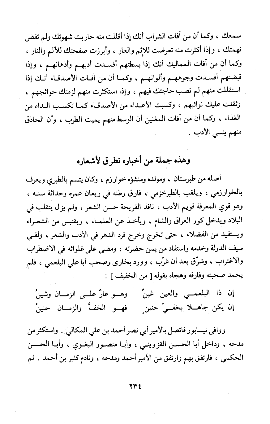 واستكثر من مدحه وداخل أَبَا الْحسن الْقزْوِينِي وَأَبا مَنْصُور الْبَغَوِيّ وَأَبا الْحسن الْحكمِي فارتفق بهم وارتفق من الْأَمِير أَحْمد ومدحه ونادم كثير بن أَحْمد