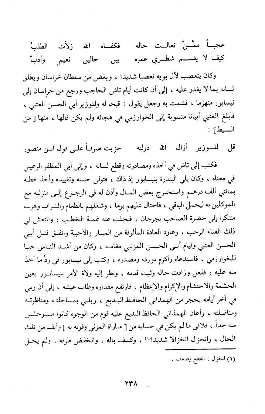 وَكَانَ يتعصب لآل بويه تعصبا شَدِيدا ويغض من سُلْطَان خُرَاسَان وَيُطلق لِسَانه بِمَا لَا يقدر عَلَيْهِ إِلَى أَن كَانَت أَيَّام تاش الْحَاجِب وَرجع من خُرَاسَان إِلَى نيسابور مُنْهَزِمًا فشمت بِهِ وَجعل يَقُول قبحا لَهُ وللوزير أبي الْحسن الْعُتْبِي فأبلغ الْعُتْبِي أبياتا منسوبة إِلَى الْخَوَارِزْمِيّ فِي هجائه وَلم يكن قَالَهَا مِنْهَا