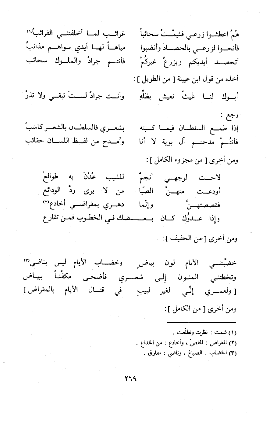 (خضبتني الْأَيَّام لون بَيَاض ... وخضاب الْأَيَّام لَيْسَ بناضي)