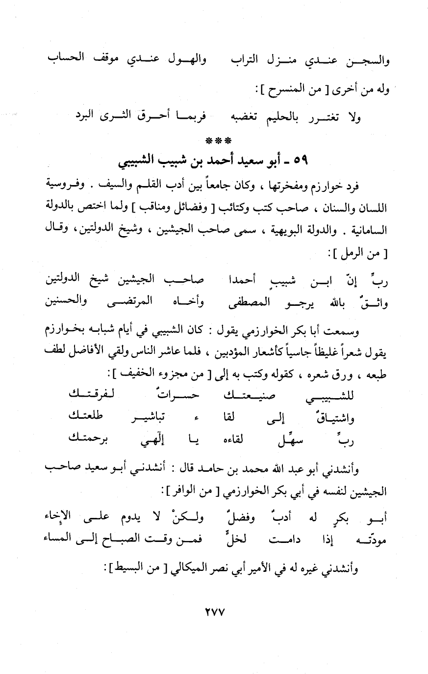 وأنشدني أَبُو عبد الله مُحَمَّد بن حَامِد قَالَ أَنْشدني أَبُو سعيد صَاحب الجيشين لنَفسِهِ فِي أبي بكر الْخَوَارِزْمِيّ