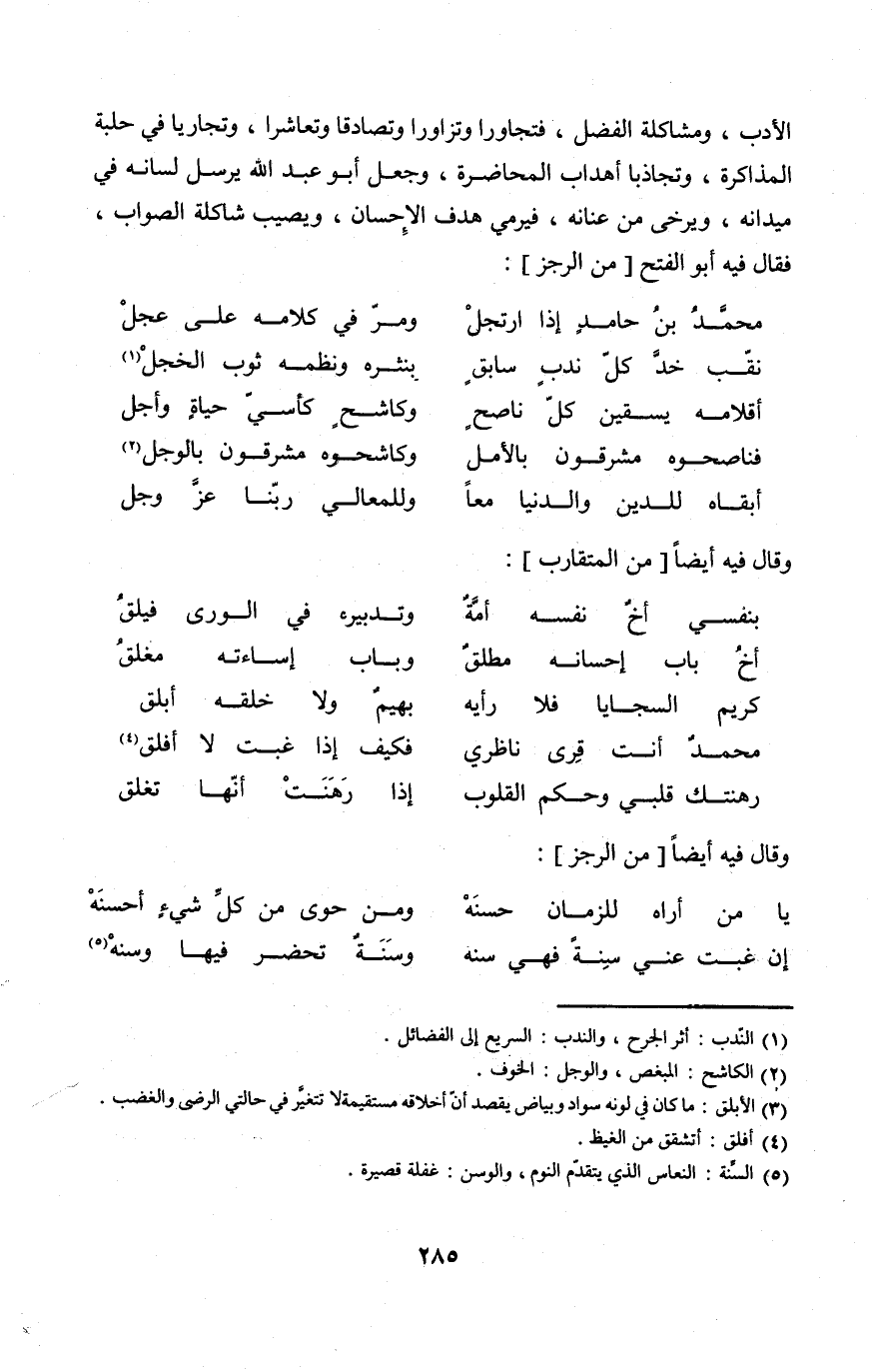 الْأَدَب ومشاكلة الْفضل فتجاورا وتزاورا وتصادقا وتعاشرا وتجاريا فِي حلبة المذاكرة وتجاذبا أهداب المحاضرة وَجعل أَبُو عبد الله يُرْسل لِسَانه فِي ميدانه ويرخى من عنانه فَيَرْمِي هدف الْإِحْسَان ويصيب شاكلة الصَّوَاب فَقَالَ فِيهِ أَبُو الْفَتْح