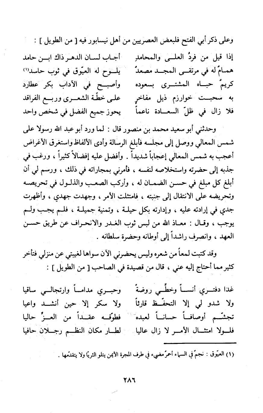 وحَدثني أَبُو سعيد مُحَمَّد بن مَنْصُور قَالَ لما ورد أَبُو عبد الله رَسُولا على شمس الْمَعَالِي وَوصل إِلَى مَجْلِسه فأبلغ الرسَالَة وَأدّى الْأَلْفَاظ واستغرق الْأَغْرَاض أعجب بِهِ شمس الْمَعَالِي إعجابا شَدِيدا