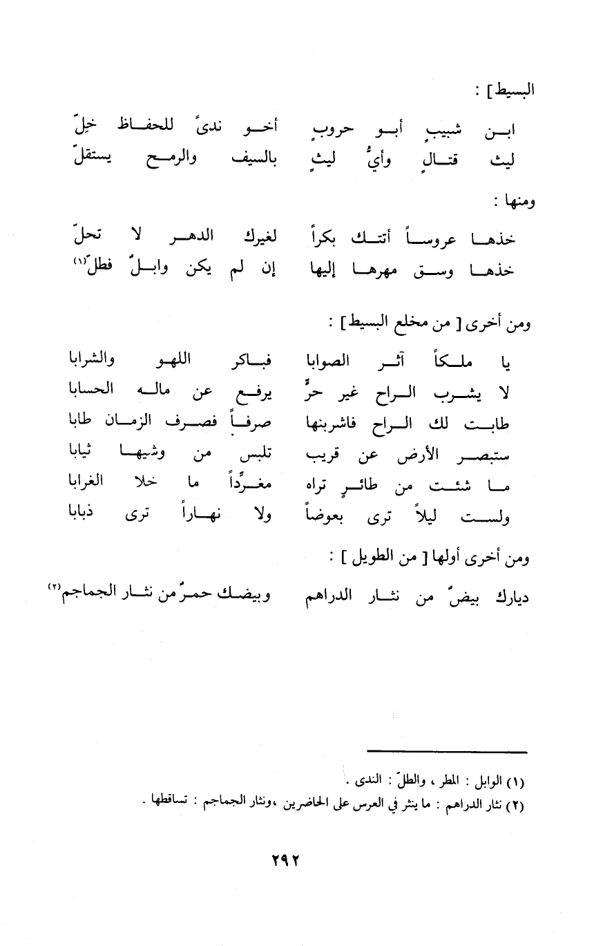 (دِيَارك بيض من نثار الدَّرَاهِم ... وبيضك حمر من نثار الجماجم) // من الطَّوِيل //