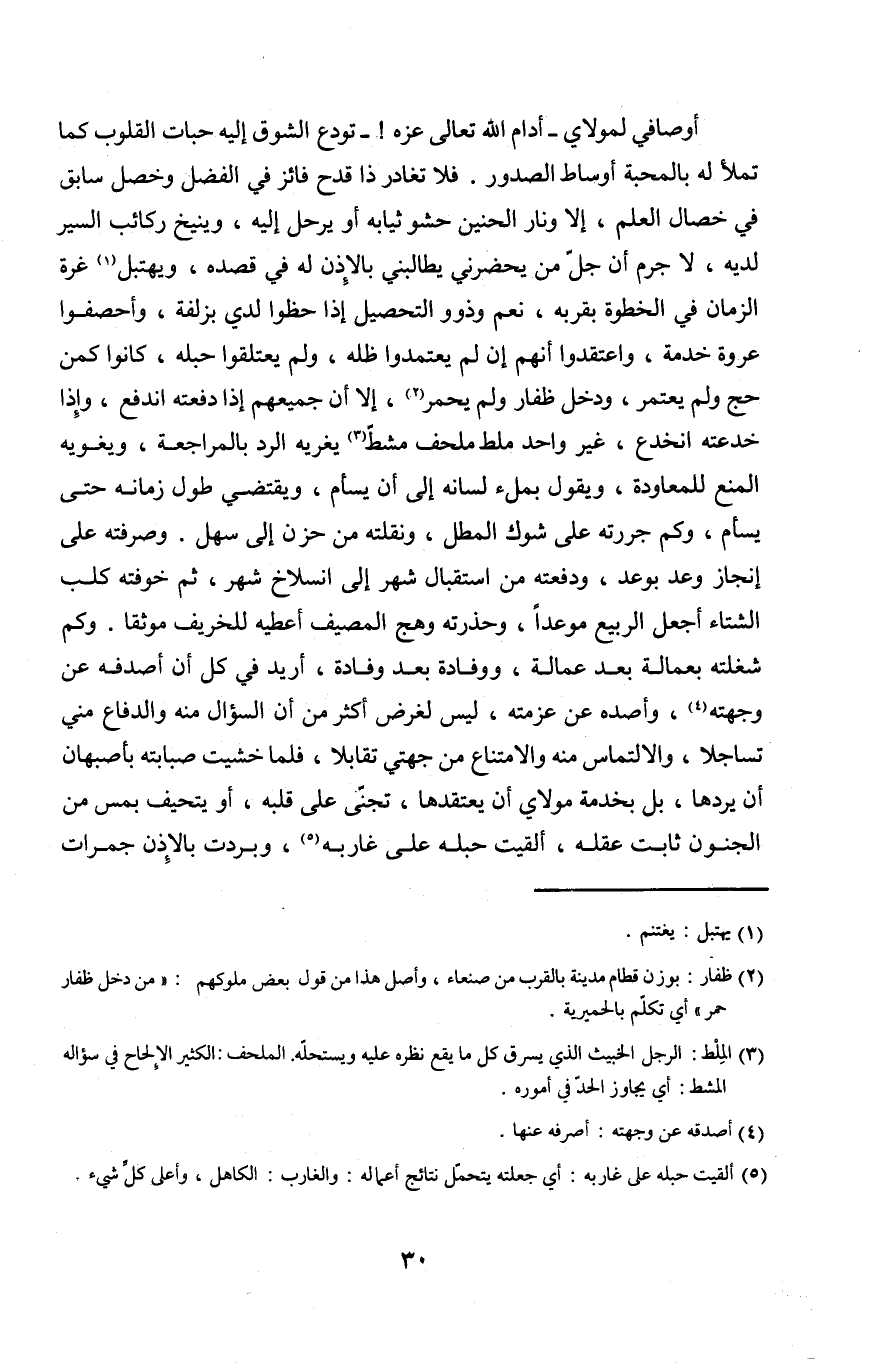 فَلَا تغادر ذَا قدح فائز فِي الْفضل وخصل سَابق فِي خِصَال الْعلم إِلَّا ونار الحنين حَشْو ثِيَابه أَو يرحل إِلَيْهِ وينيخ ركائب السّير لَدَيْهِ لَا جرم أَن جلّ من يحضرني يطالبني بِالْإِذْنِ لَهُ فِي قَصده ويهتبل غرَّة الزَّمَان فِي الخطوة بِقُرْبِهِ نعم وذوو التَّحْصِيل إِذا حظوا لدي بزلفة وأحصفوا عُرْوَة خدمَة واعتقدوا أَنهم إِن لم يعتمدوا ظله وَلم يعتلقوا حبله كَانُوا كمن حج وَلم يعْتَمر وَدخل ظفار وَلم يحمر إِلَّا أَن جَمِيعهم إِذا دَفعته انْدفع وَإِذا خدعته انخدع غير وَاحِد ملط ملحف مشط يغريه الرَّد بالمراجعة ويغويه الْمَنْع للمعاودة وَيَقُول بملء لِسَانه إِلَى أَن يسأم وَيَقْتَضِي طول زَمَانه حَتَّى يسأم وَكم جررته على شوك المطل ونقلته من حزن إِلَى سهل