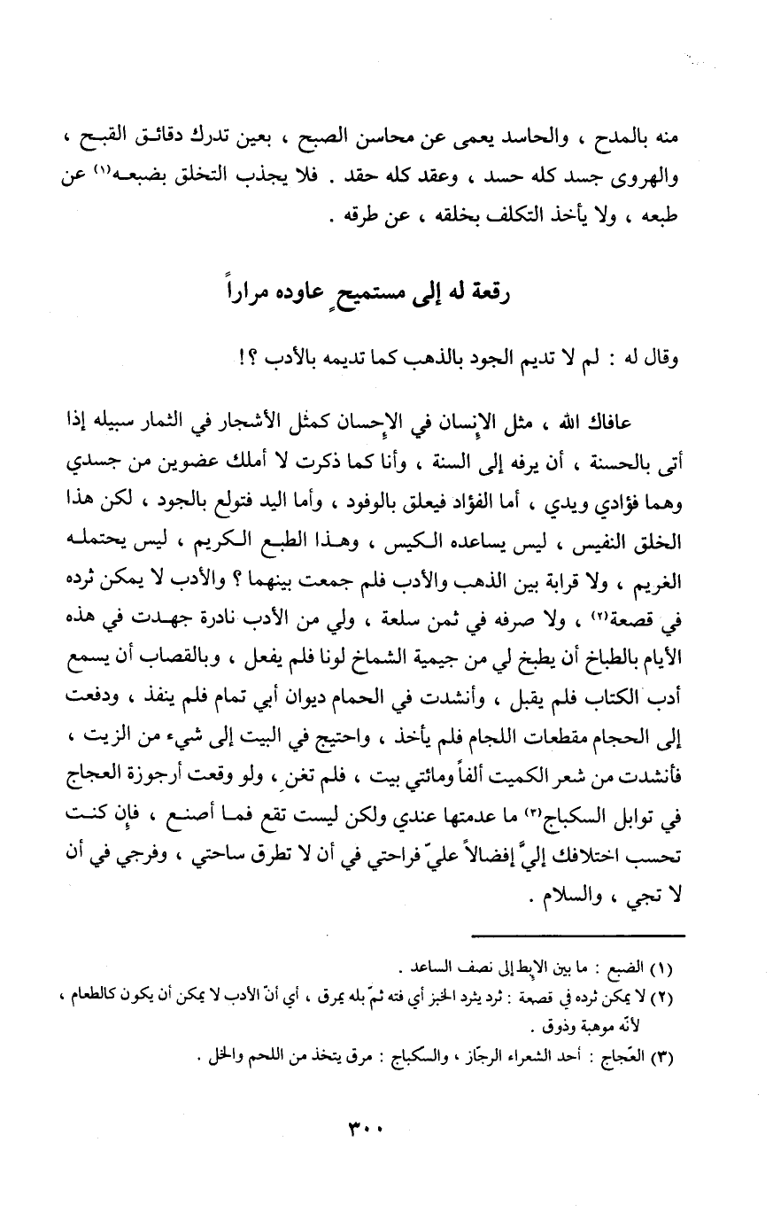 عافاك الله مثل الْإِنْسَان فِي الْإِحْسَان كَمثل الْأَشْجَار فِي الثِّمَار سَبيله إِذا أَتَى بِالْحَسَنَة أَن يرفه إِلَى السّنة وَأَنا كَمَا ذكرت لَا أملك عضوين من جَسَدِي وهما فُؤَادِي ويدي أما الْفُؤَاد فيعلق بالوفود وَأما الْيَد فتولع بالجود لَكِن هَذَا الْخلق النفيس لَيْسَ يساعده الْكيس وَهَذَا الطَّبْع الْكَرِيم لَيْسَ يحْتَملهُ الْغَرِيم وَلَا قرَابَة بَين الذَّهَب وَالْأَدب فَلم جمعت بَينهمَا وَالْأَدب لَا يُمكن ثرده فِي قَصْعَة وَلَا صرفه فِي ثمن سلْعَة ولي من الْأَدَب نادرة جهدت فِي هَذِه الْأَيَّام بالطباخ أَن يطْبخ لي من جيمية الشماخ لونا فَلم يفعل وبالقصاب أَن يسمع أدب الْكتاب فَلم يقبل وأنشدت فِي الْحمام ديوَان أبي تَمام فَلم ينفذ وَدفعت إِلَى الْحجام مقطعات اللجام فَلم يَأْخُذ واحتيج فِي الْبَيْت إِلَى شَيْء من الزَّيْت فأنشدت من شعر الْكُمَيْت ألفا ومائتي بَيت فَلم تغن وَلَو وَقعت أرجوزة العجاج فِي توابل السكباج مَا عدمتها عِنْدِي وَلَكِن لَيست تقع فَمَا أصنع فَإِن كنت تحسب اختلافك إِلَيّ إفضالا عَليّ فراحتي فِي أَن لَا تطرق ساحتي وفرجي فِي أَن لَا تجي وَالسَّلَام