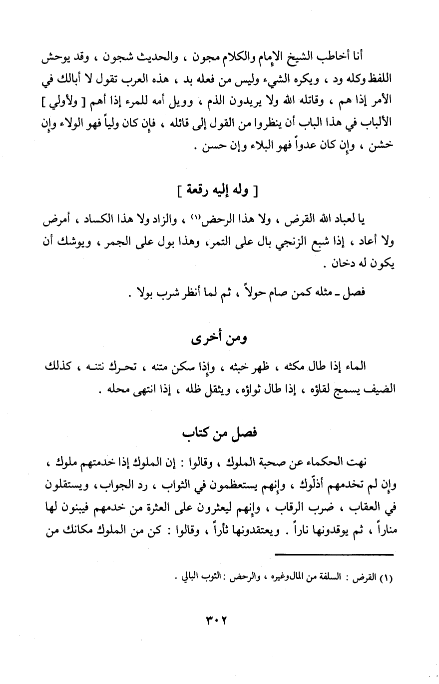 نهت الْحُكَمَاء عَن صُحْبَة الْمُلُوك وَقَالُوا إِن الْمُلُوك إِذا خدمتهم مُلُوك وَإِن لم تخدمهم أذلوك وَإِنَّهُم يستعظمون فِي الثَّوَاب رد الْجَواب ويستقلون فِي الْعقَاب ضرب الرّقاب وَإِنَّهُم ليعثرون على العثرة من خدمهم فيبنون لَهَا منارا ثمَّ يوقدونها نَارا