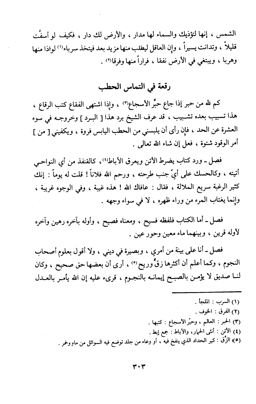 كم لله من حبر إِذا جَاع حبر الأسجاع وَإِذا اشْتهى الفقاع كتب الرّقاع هَذَا تسبيب بعدة تشبيب قد عرف الشَّيْخ برد هَذَا الْبرد وَخُرُوجه فِي سوء الْعشْرَة عَن الْحَد فَإِن رأى أَن يلبسني من الْحَطب الْيَابِس فَرْوَة ويكفيني من أَمر الْوقُود شتوة فعل إِن شَاءَ الله تَعَالَى