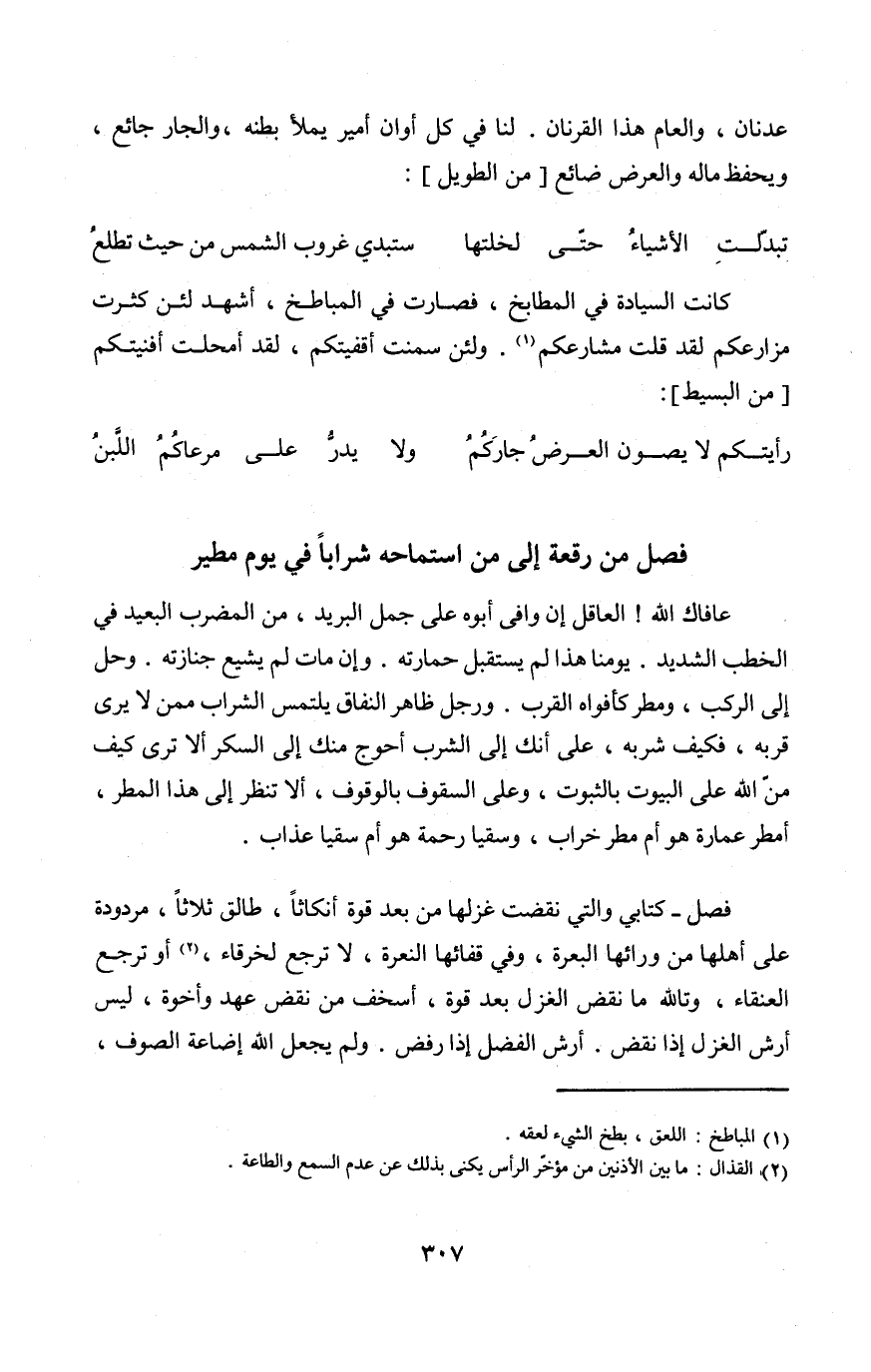 وَرجل ظَاهر النِّفَاق يلْتَمس الشَّرَاب مِمَّن لَا يرى قربه فَكيف شربه على أَنَّك إِلَى الشّرْب أحْوج مِنْك إِلَى السكر أَلا ترى كَيفَ من الله على الْبيُوت بالثبوت وعَلى السقوف بِالْوُقُوفِ أَلا تنظر إِلَى هَذَا الْمَطَر أمطر عمَارَة هُوَ أم مطر خراب وسقيا رَحْمَة هُوَ أم سقيا عَذَاب