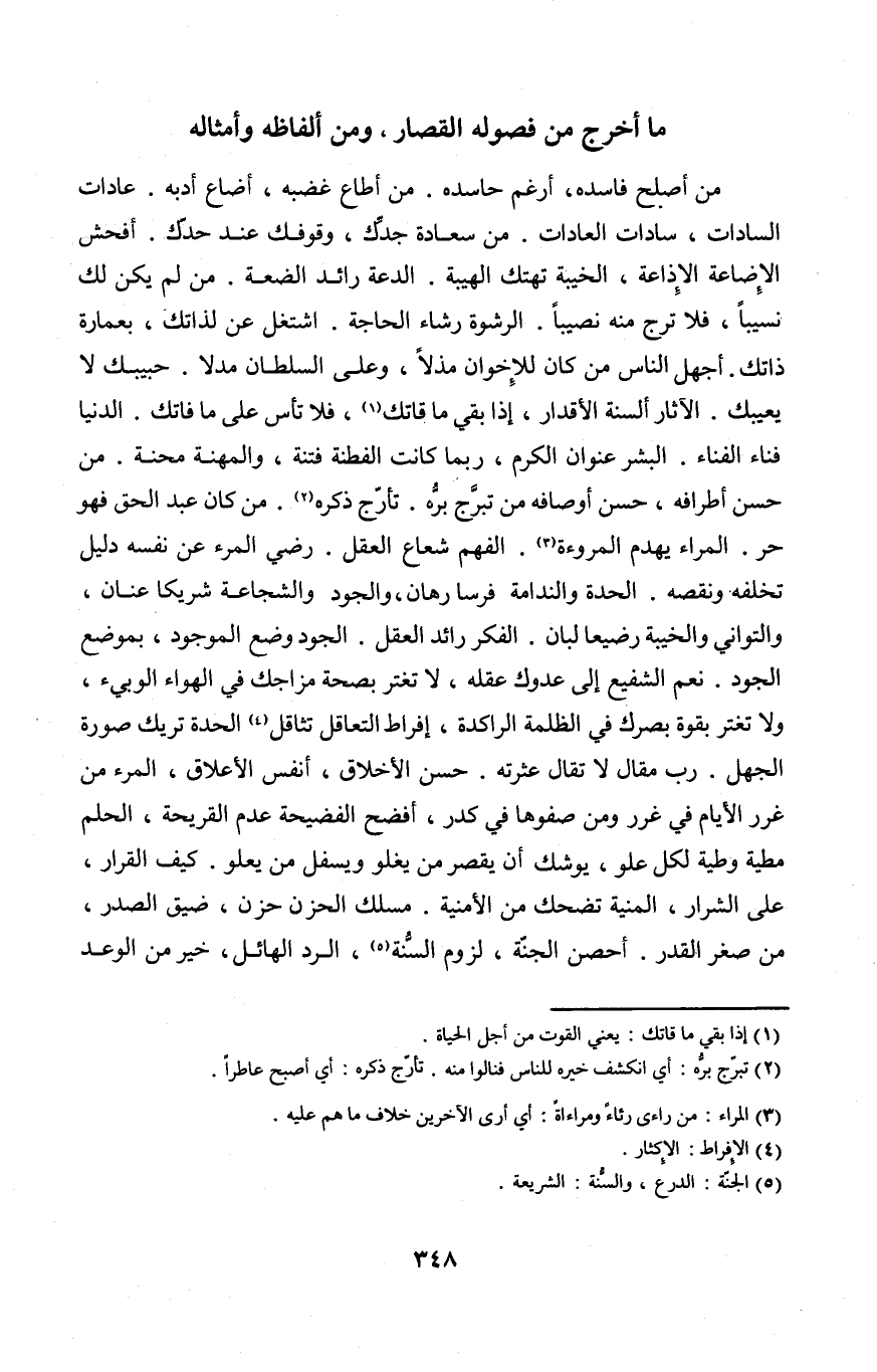 حسن الْأَخْلَاق أنفس الأعلاق الْمَرْء من غرر الْأَيَّام فِي غرر وَمن صفوها فِي كدر أفضح الفضيحة عدم القريحة الْحلم مَطِيَّة وطية لكل علو يُوشك أَن يقصر من يغلو ويسفل من يَعْلُو