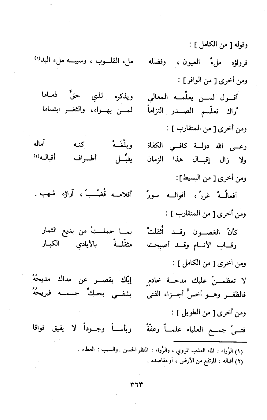 (فرواؤه ملْء الْعُيُون وفضله ... ملْء الْقُلُوب وسيبه ملْء الْيَد) // من الْكَامِل //