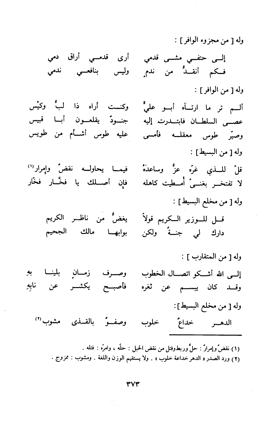 (إِلَى الله أَشْكُو اتِّصَال الخطوب ... وَصرف زمَان بلينا بِهِ)