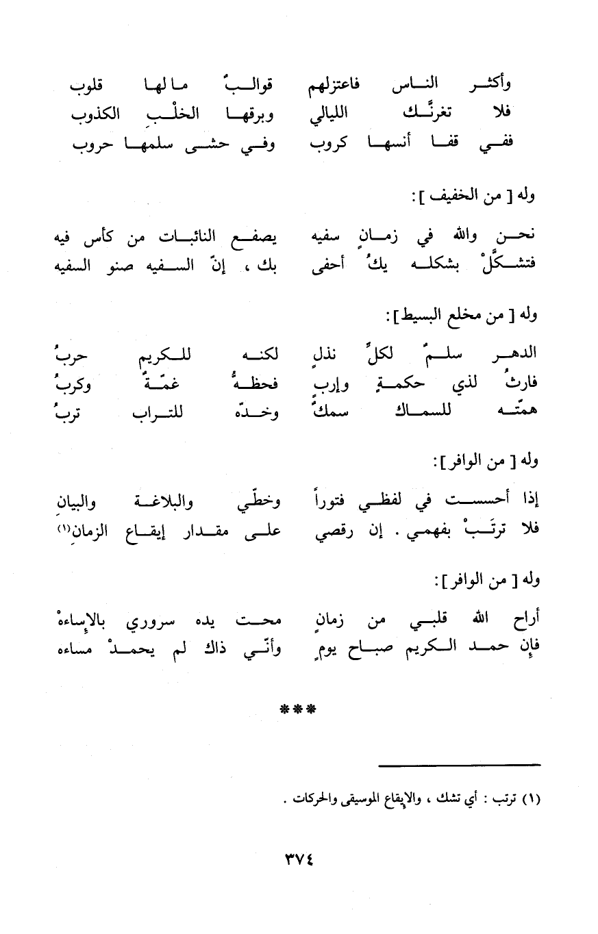 (فَلَا ترَتّب بفهمي إِن رفصي ... على مِقْدَار إِيقَاع الزَّمَان) // من الوافر //