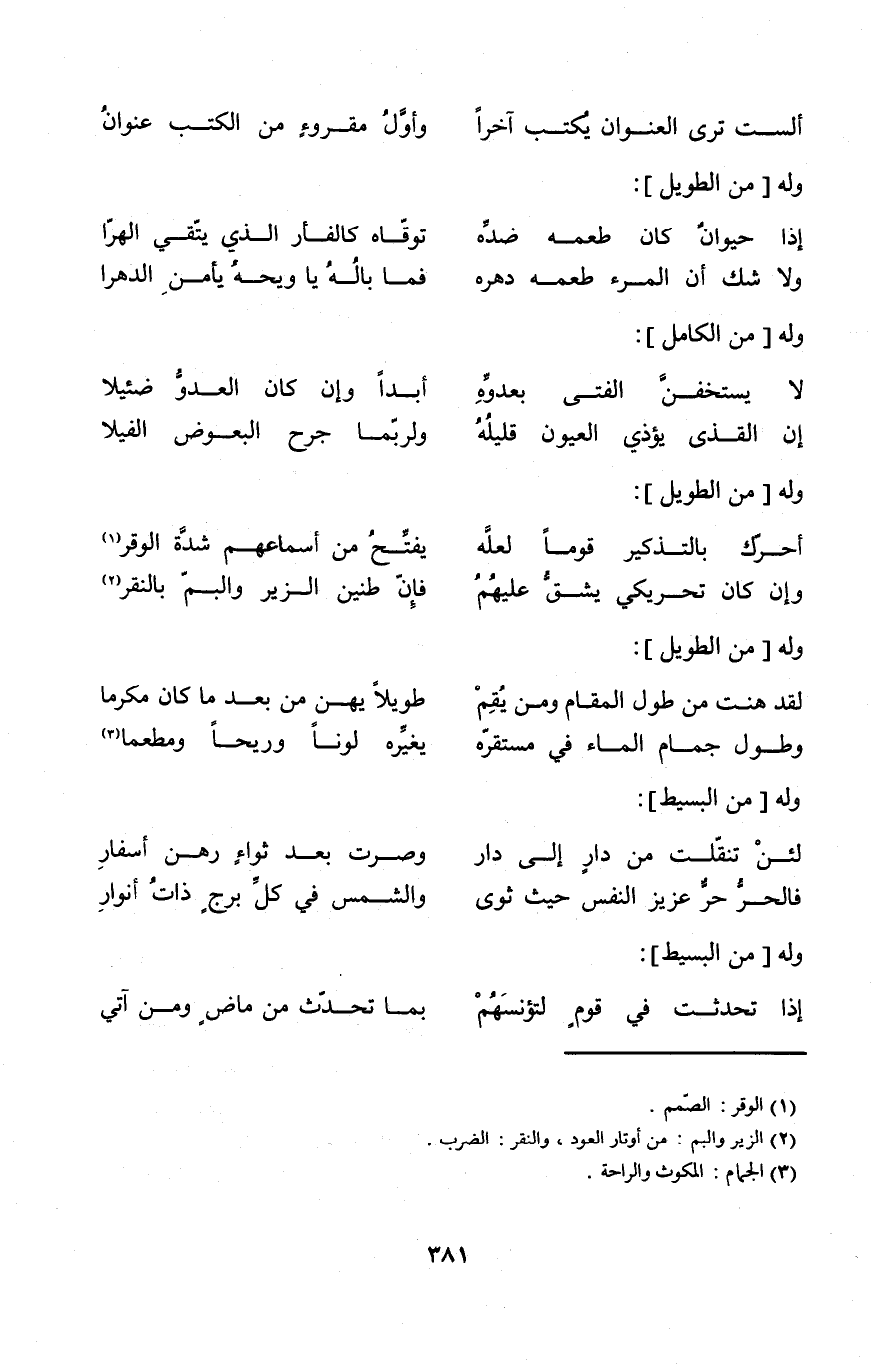 (أَلَسْت ترى العنوان يكْتب آخرا ... وَأول مقروء من الْكتب عنوان) // من الطَّوِيل //