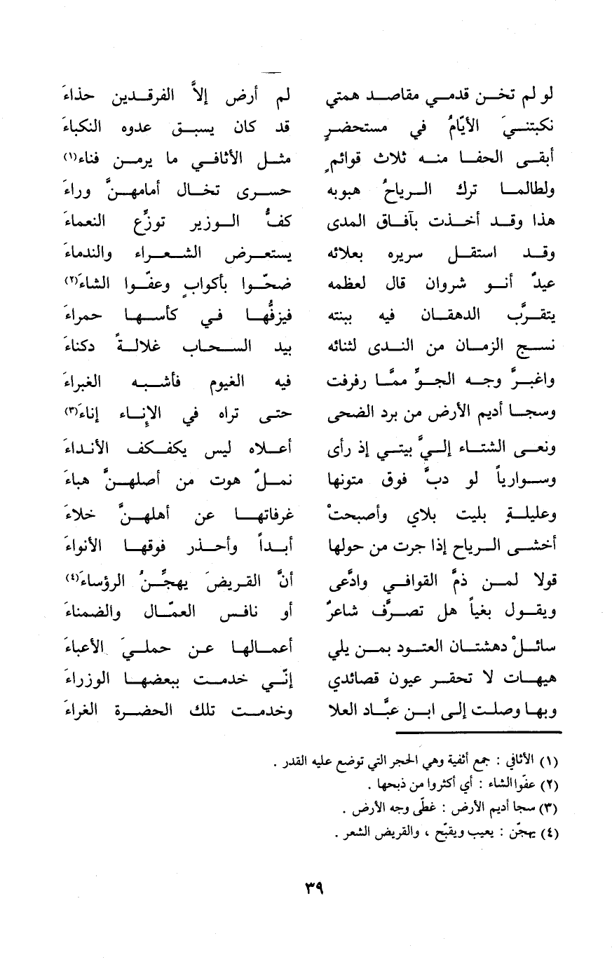 (أبقى الحفا مِنْهُ ثَلَاث قَوَائِم ... مثل الأثافي مَا يرمن فنَاء)