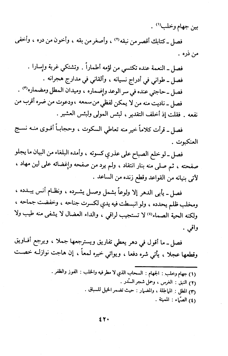 فصل يَأْبَى الدَّهْر إِلَّا ولوعا بشمل وصل يشرده ونظام أنس يبدده ومخلب ظلم يحدده وَلَو انبسطت فِيهِ يَدي لكسرت جنَاحه وخفضت جماحه وَلكنه الْحَيَّة الصماء لَا تَسْتَجِيب لراقي والداء العضال لَا يشفى مِنْهُ طيب وَلَا واقي