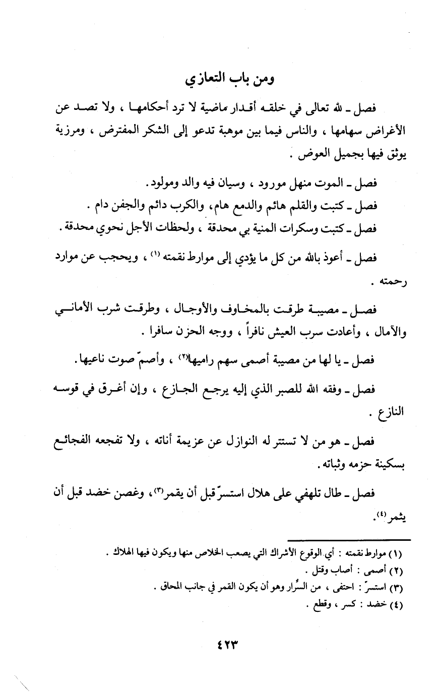 فصل هُوَ من لَا تستتر لَهُ النَّوَازِل عَن عَزِيمَة أناته وَلَا تفجعه الفجائع بسكينة حزمه وثباته