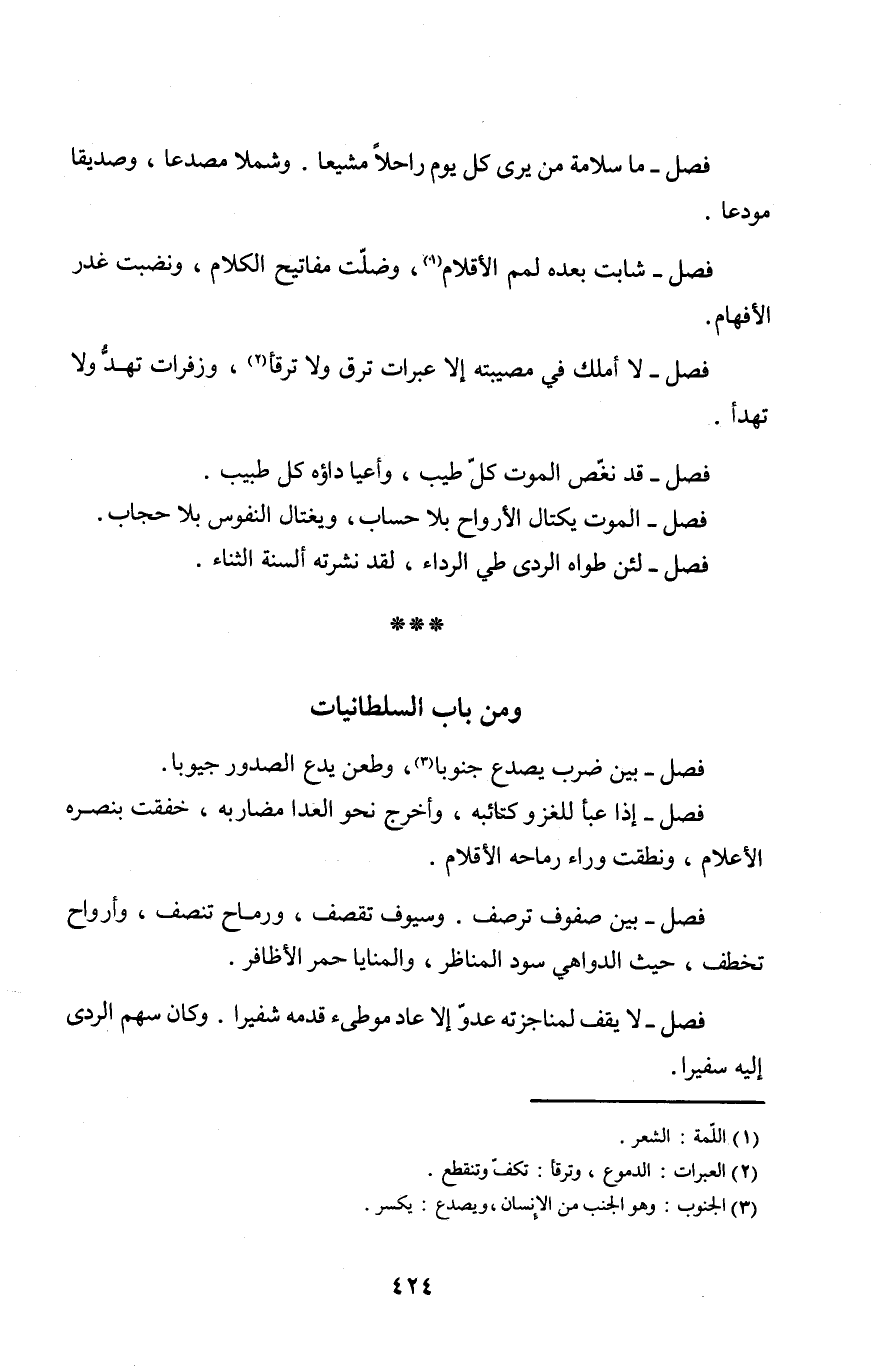 فصل إِذا عبأ للغزو كتائبه وَأخرج نَحْو العدا مضاربه خَفَقت بنصره الْأَعْلَام ونطقت وَرَاء رماحه الأقلام