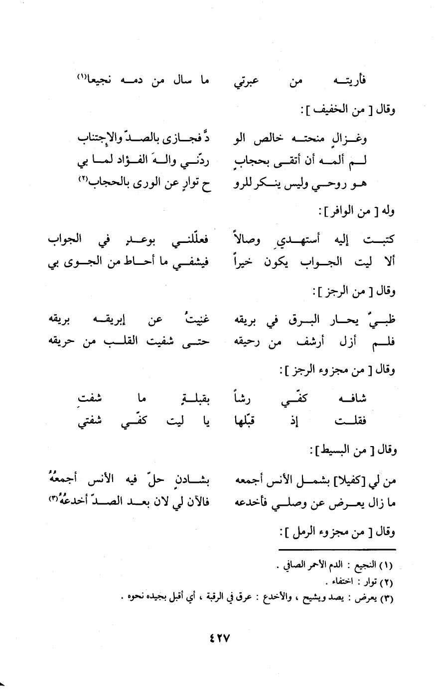 (فأريته من عبرتي ... مَا سَالَ من دَمه نجيعا) // من مجزوء الْكَامِل //